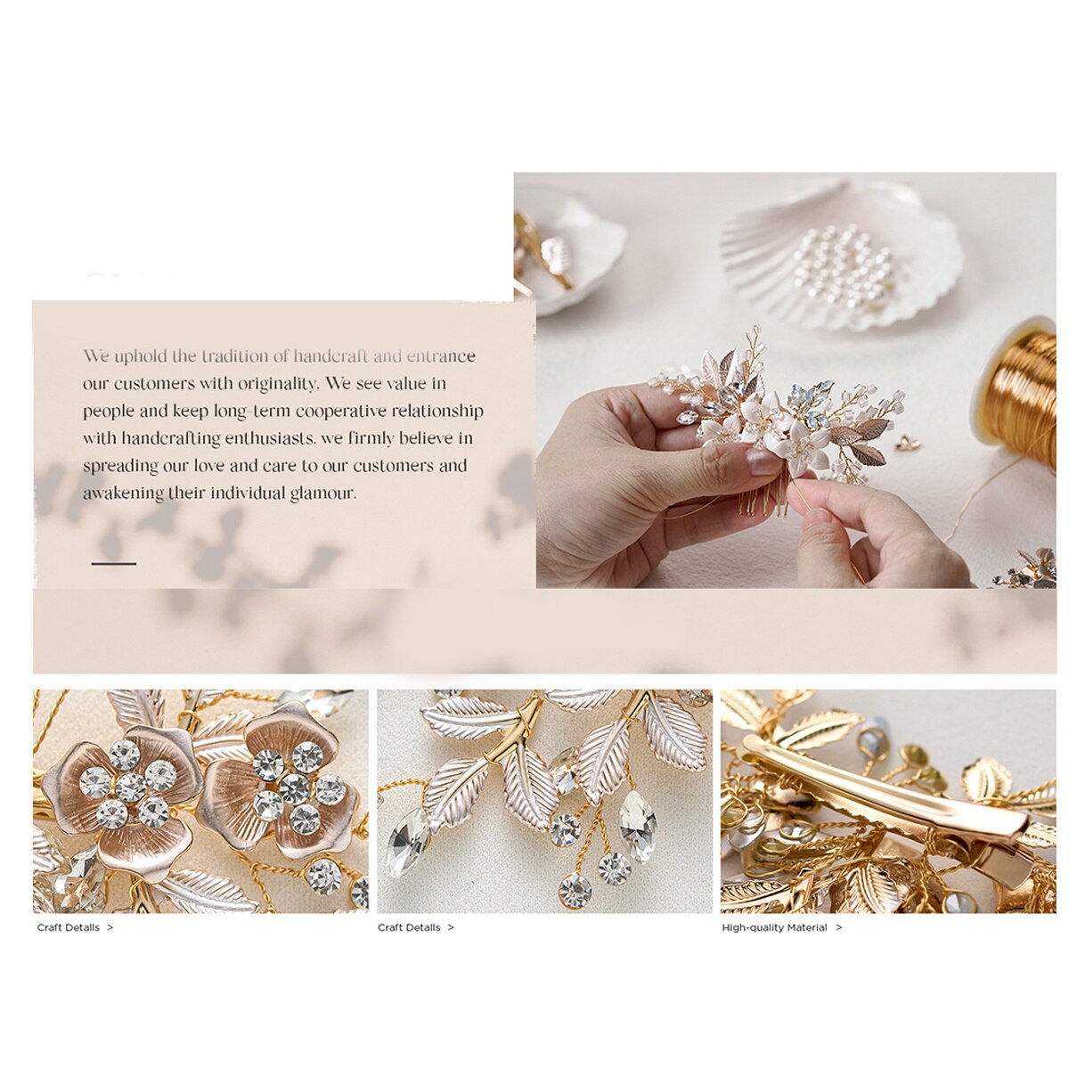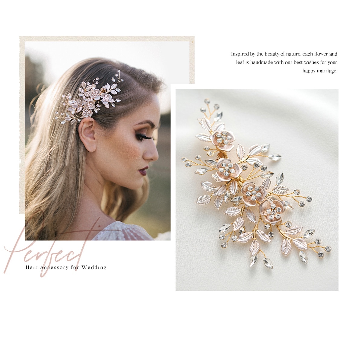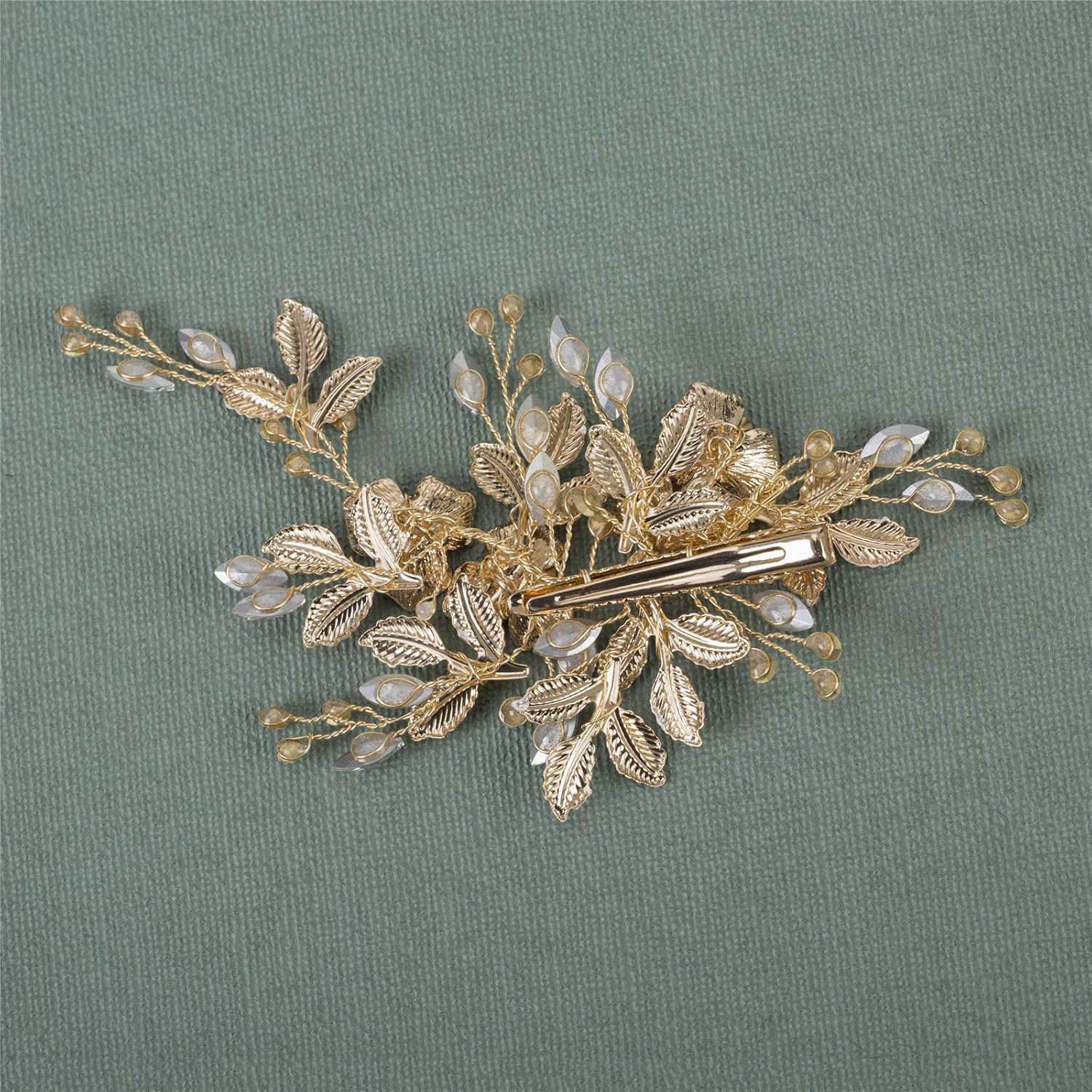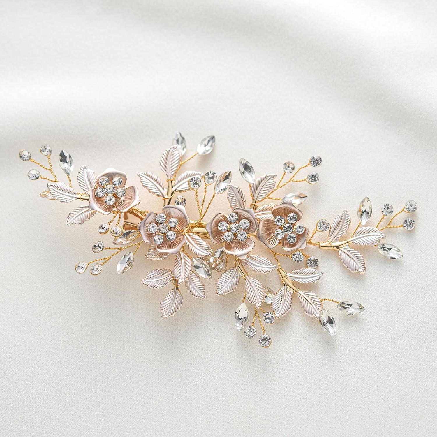 Accesoriu Par pentru Mireasa, JENUOS, handmade, tip Bijuterie, Decorat cu frunze, cristale albe, flori, Aur