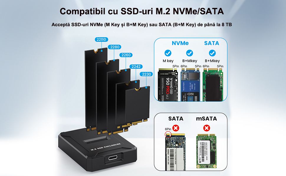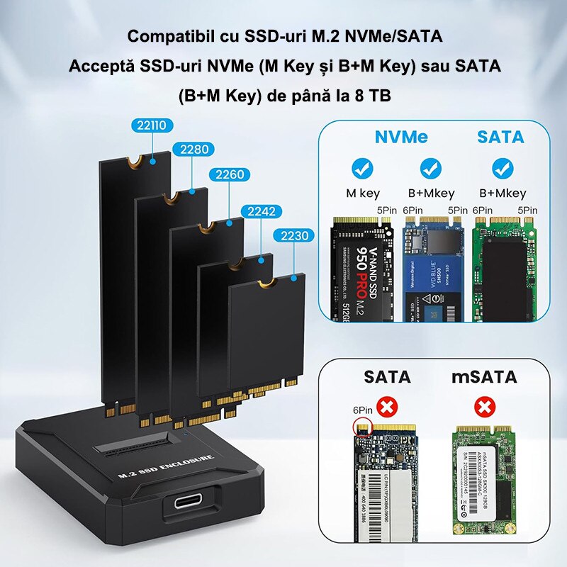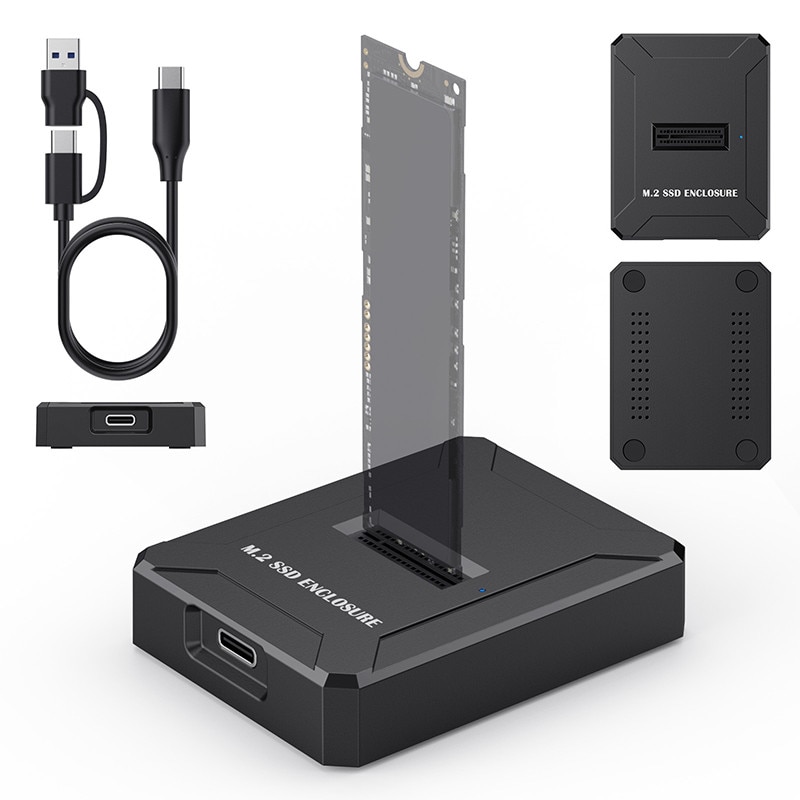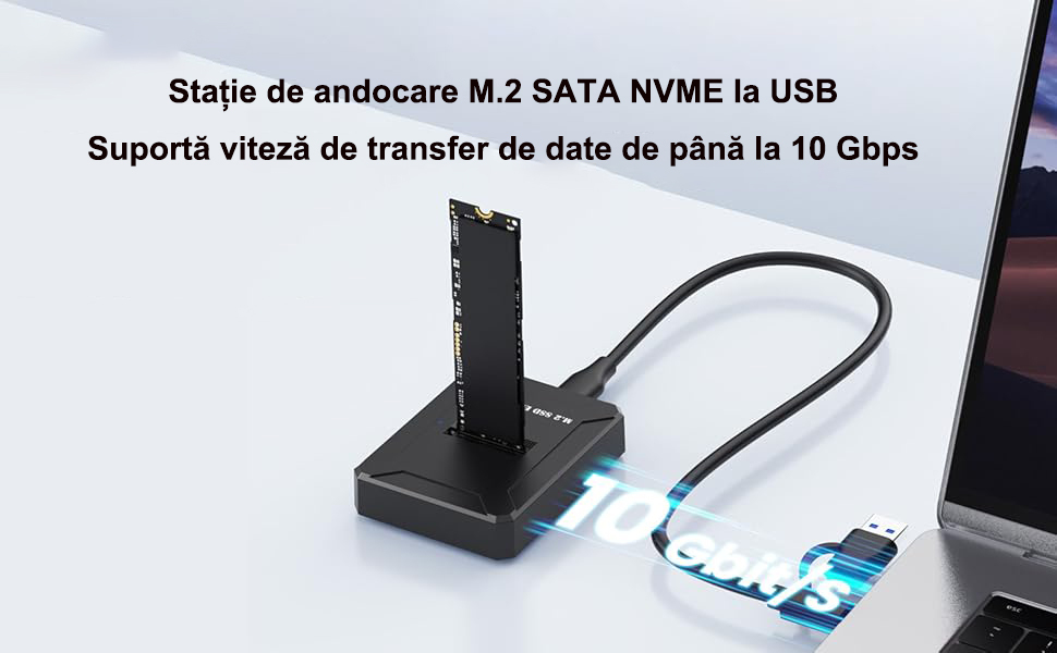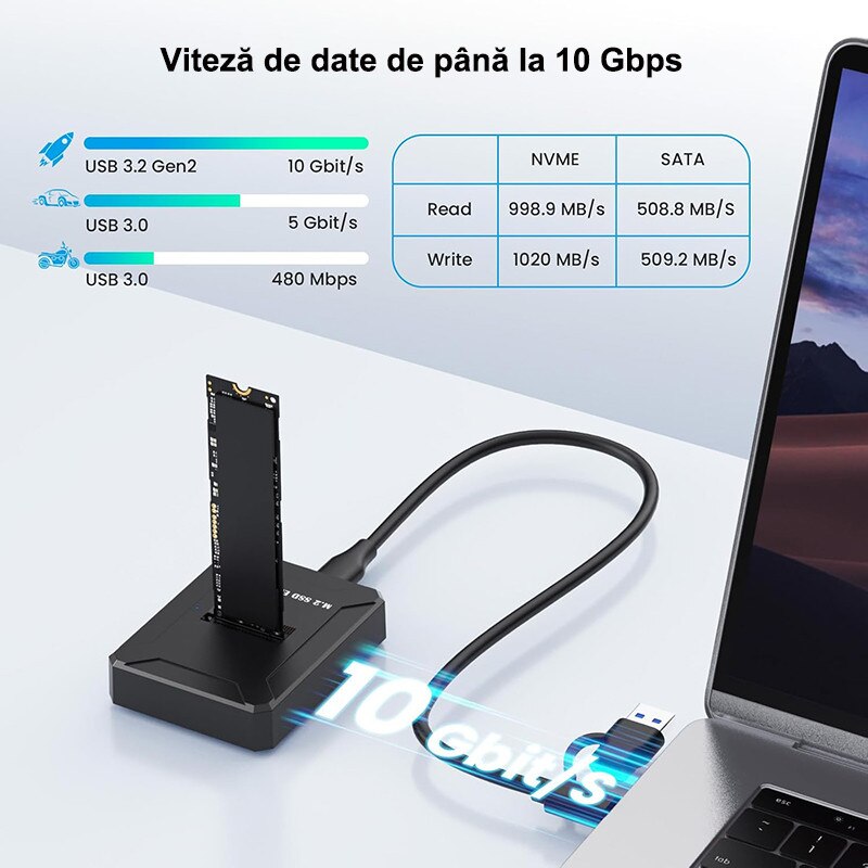 Adaptor Cititor M.2 NVMe & SATA extern SSD, Omelivon, USB 3.1, M.2 SSD Docking Station, Enclosure Pentru 2230/2242/2260/2280 M.2 NVMe SATA NGFF SSD De M-Key SI B+M, Cablu inclus, Negru