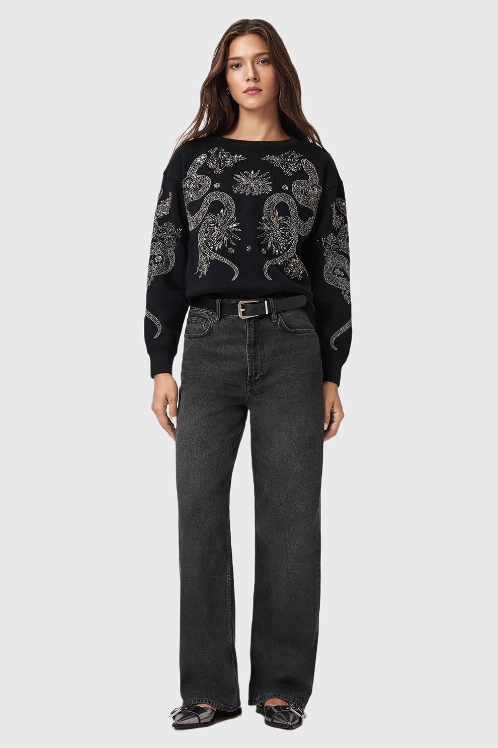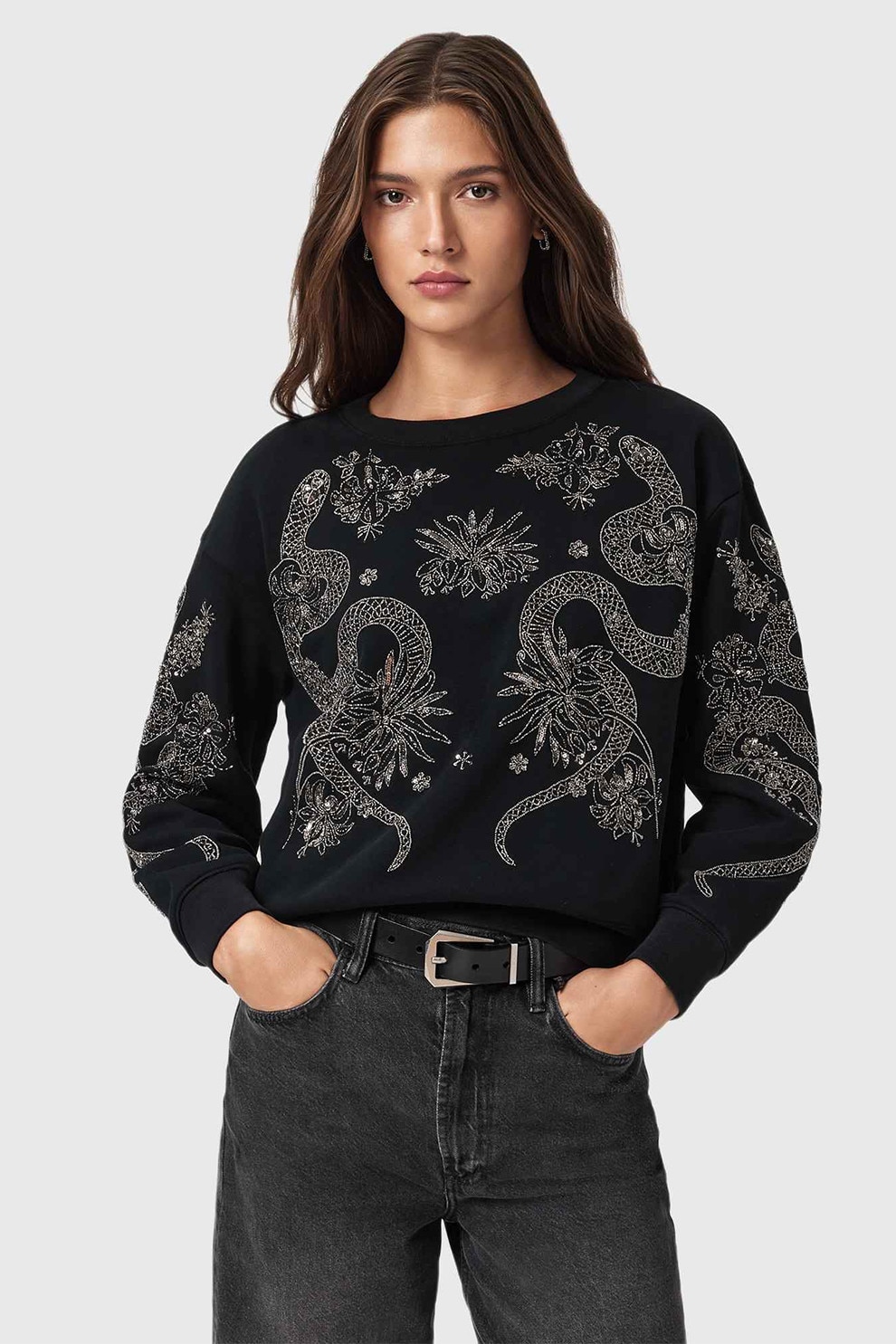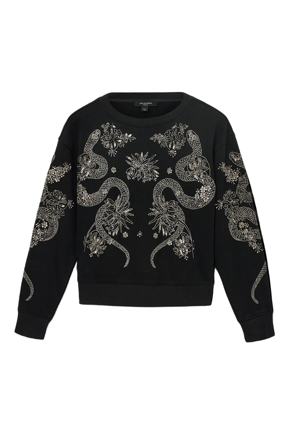 AllSaints - Bluza de trening cu aplicatie cu margele Cecile, Negru/Argintiu