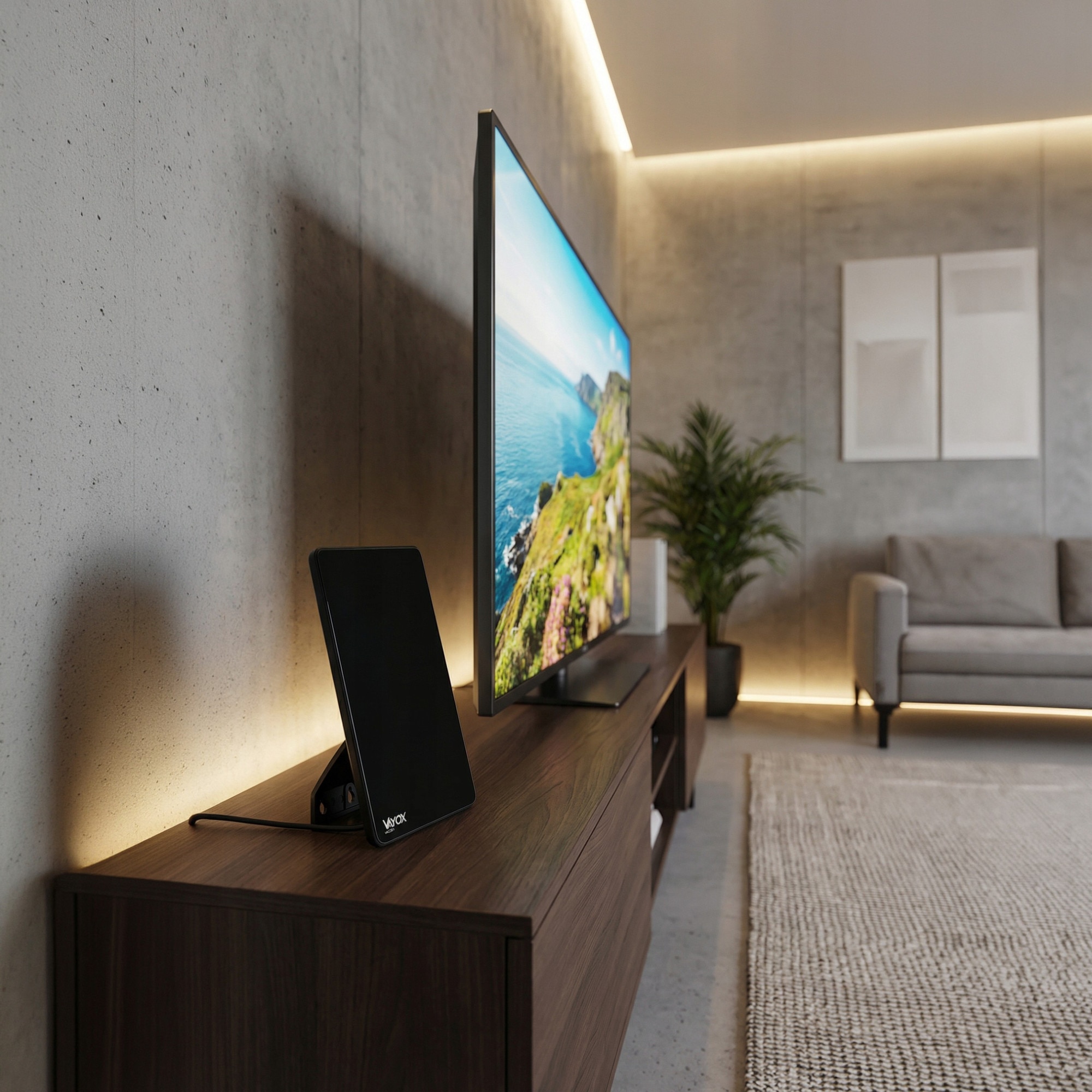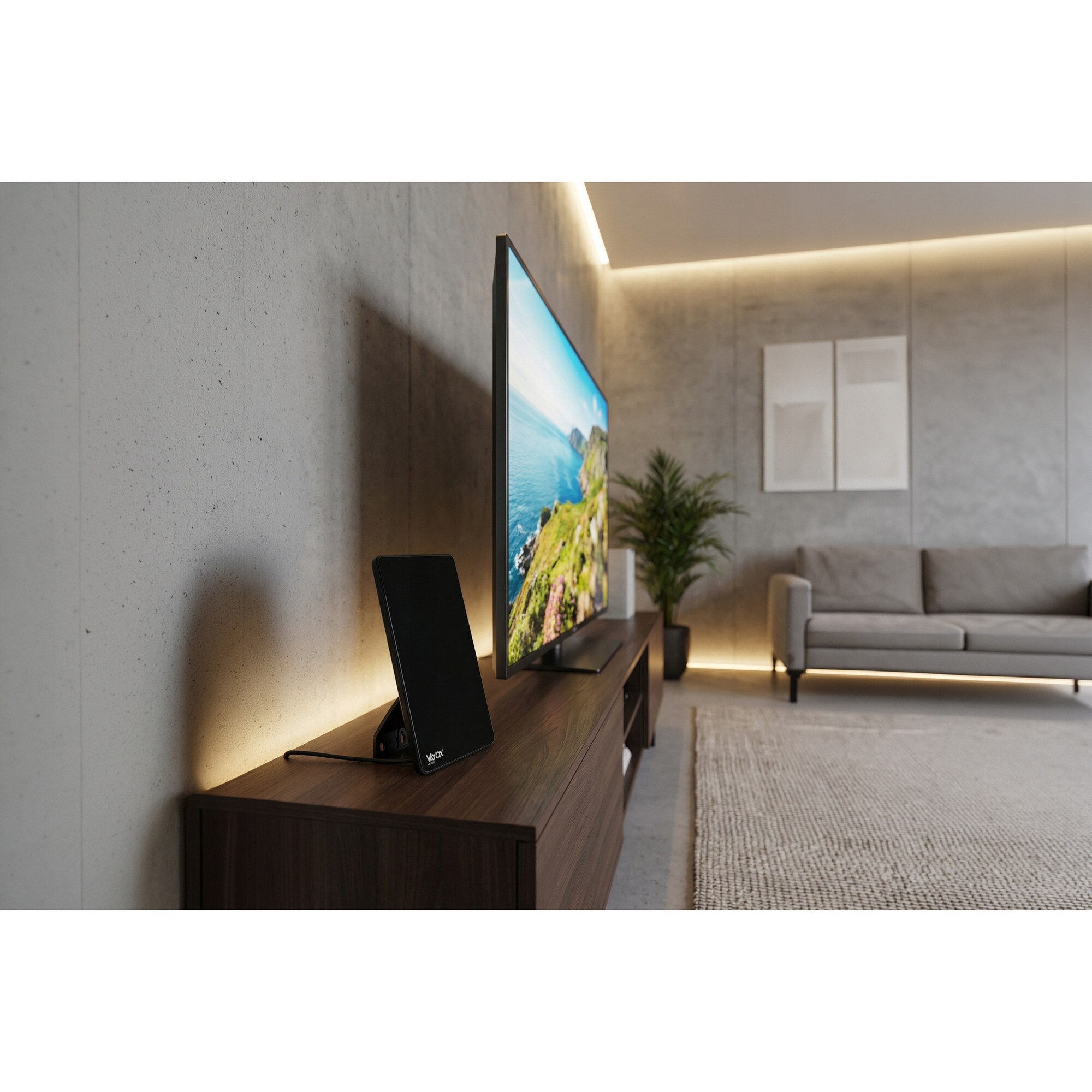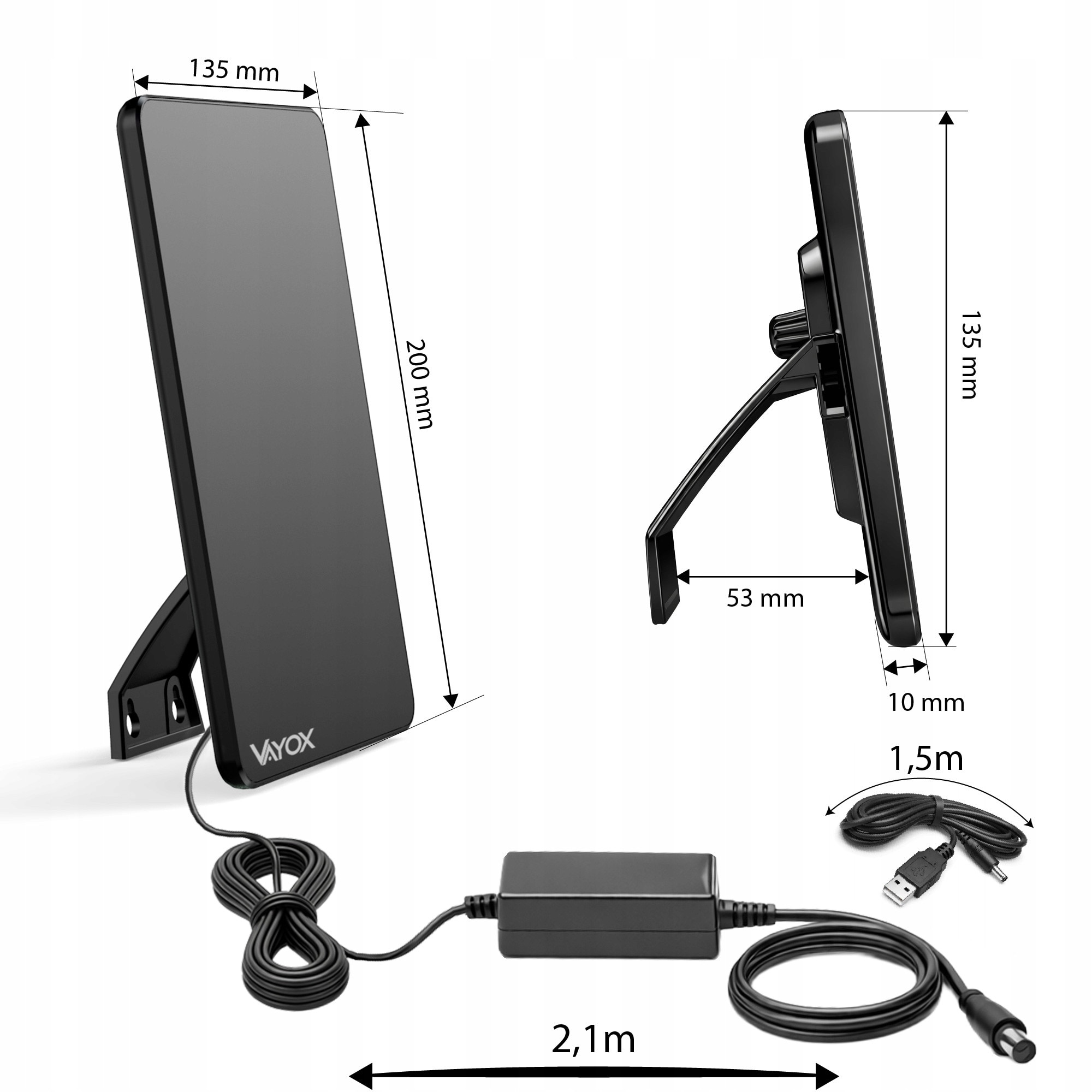 Antena TV Vayox, pentru televiziune terestra DVB-T/DVB-T2, Cu amplificator, interioara, VHF, UHF, FULL HD, 4K, filtru LTE 4G, Cablu 2m, 5V