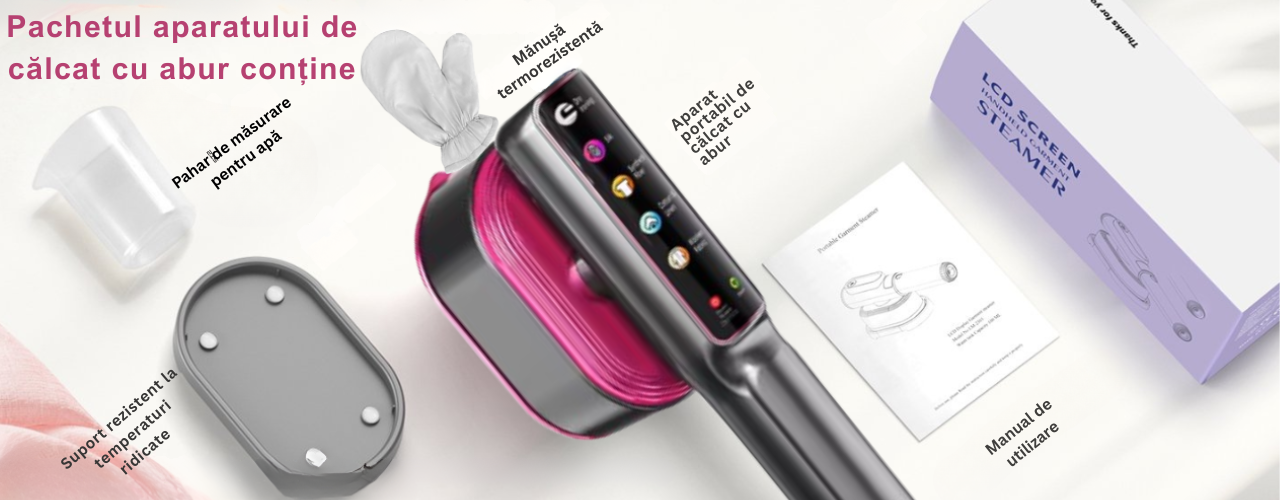 | Continut pachet | 1 Manual de utilizare 1 x Manusa protectie 1 x Aparat de calcat cu abur 1 recipient alimentare cu apa |