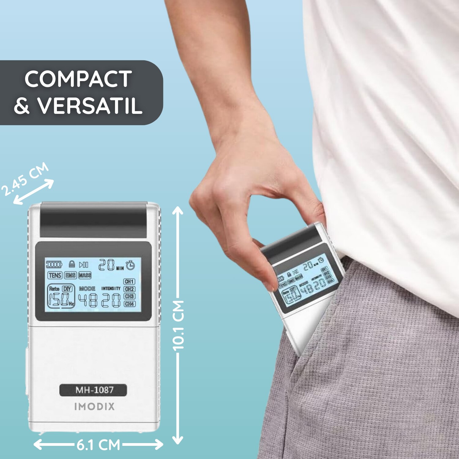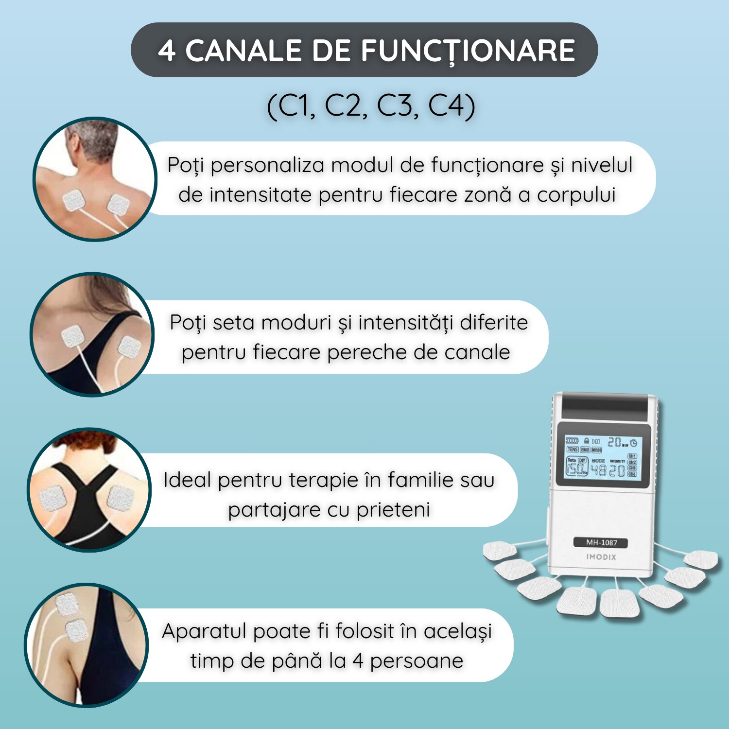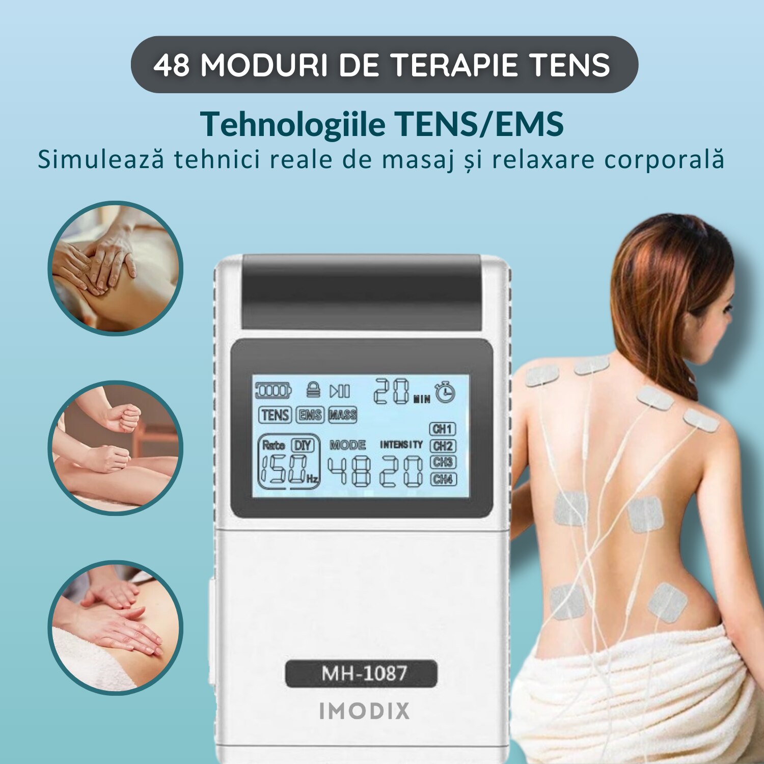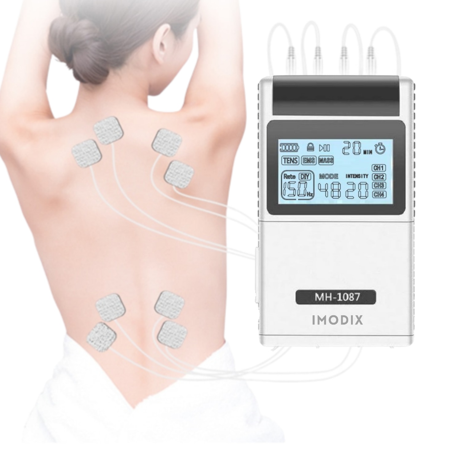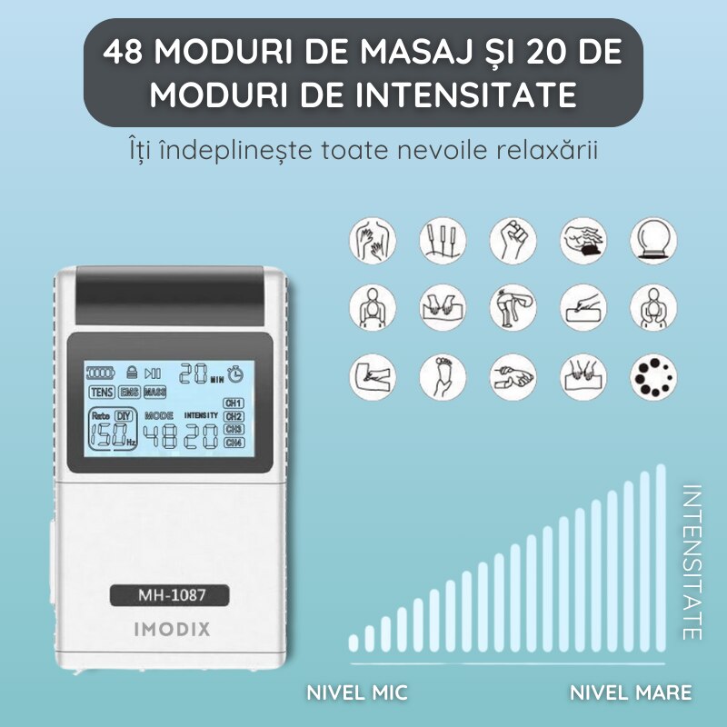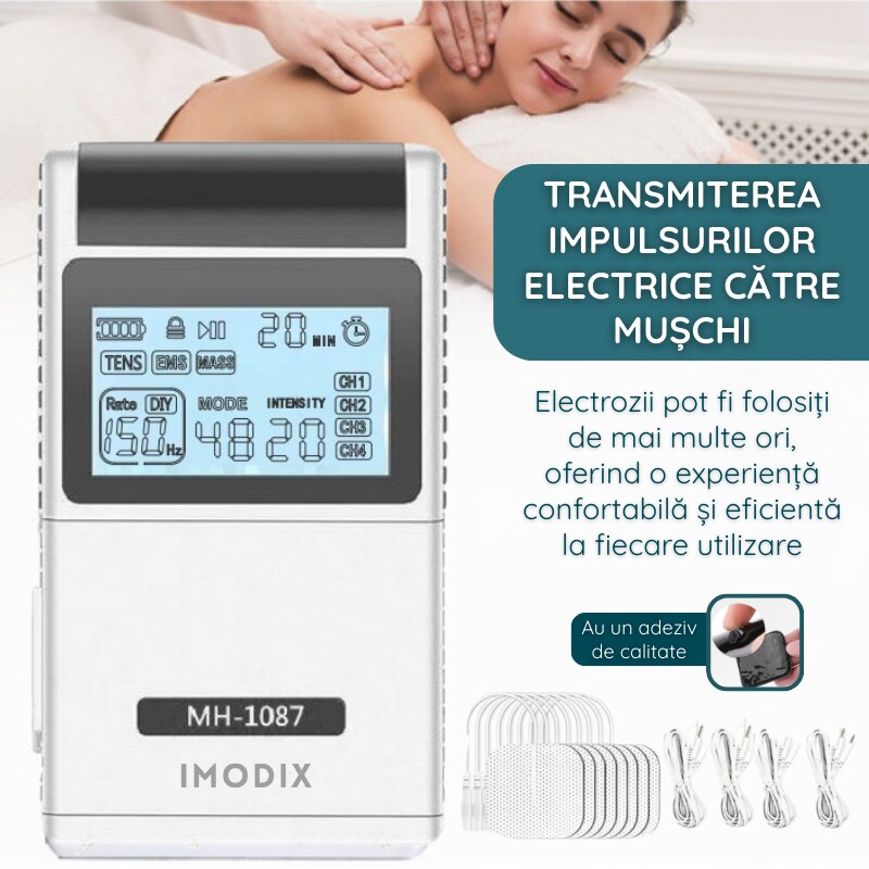 Aparat De Masaj Cu Electrostimulare/Fizioterapie, IMODIX®, Stimulator, Cu 20 Nivele De Intensitate, 8 Electrozi, 4 Canale De Utilizare, 48 Programe De Masaj, Ecran LCD, MH-1087, Argintiu