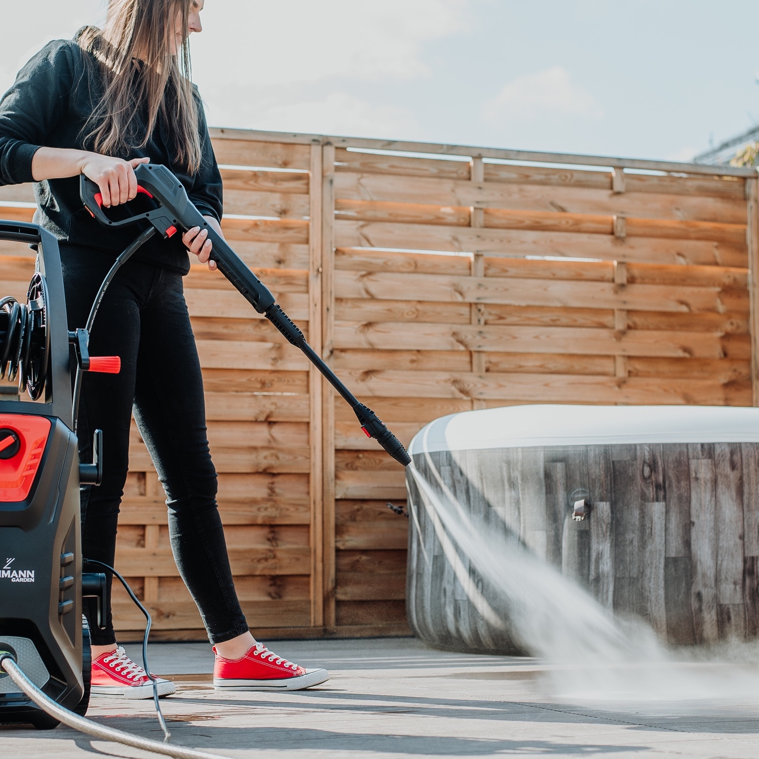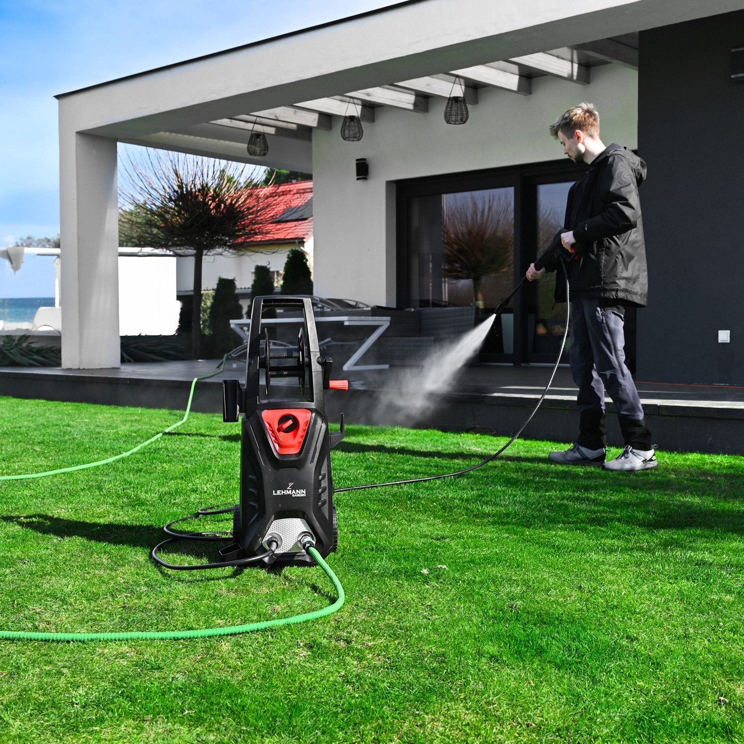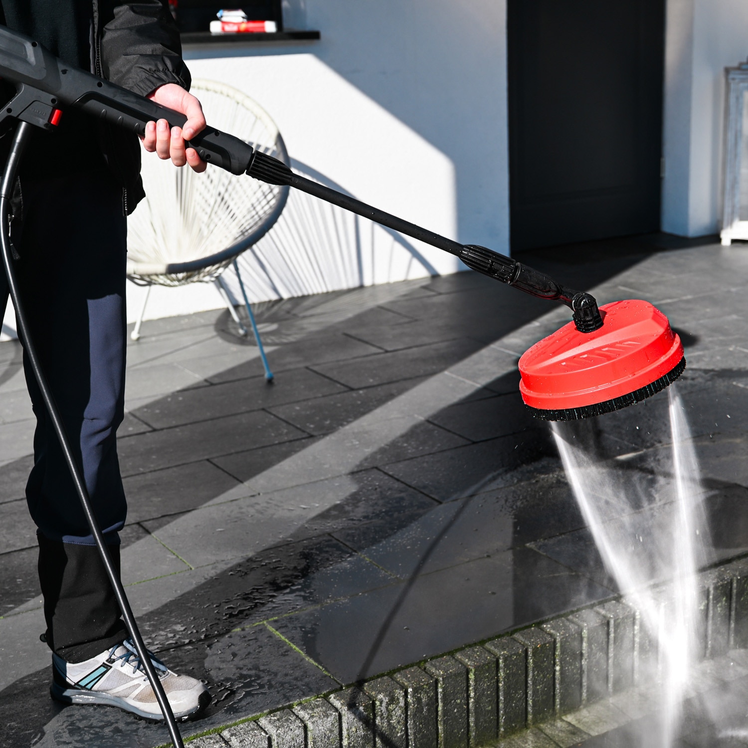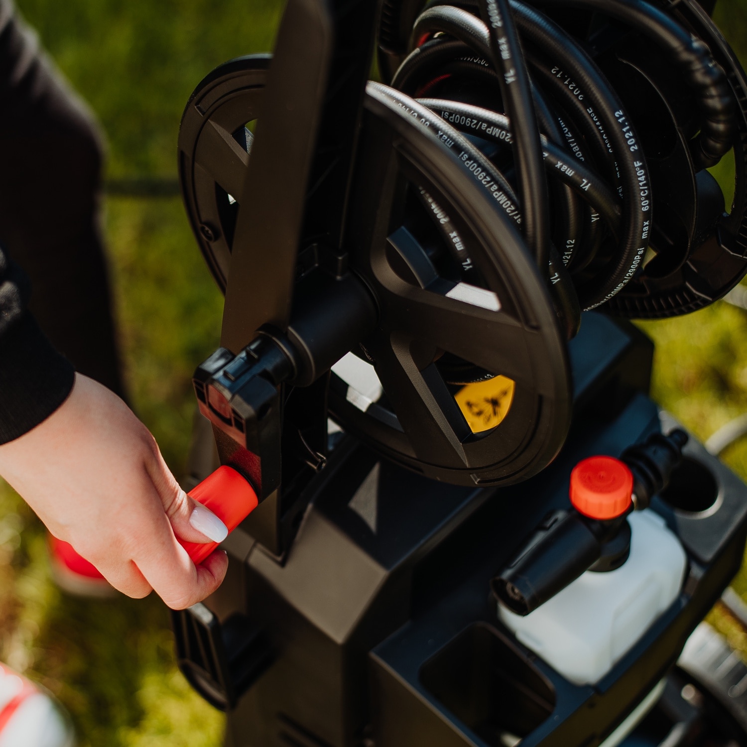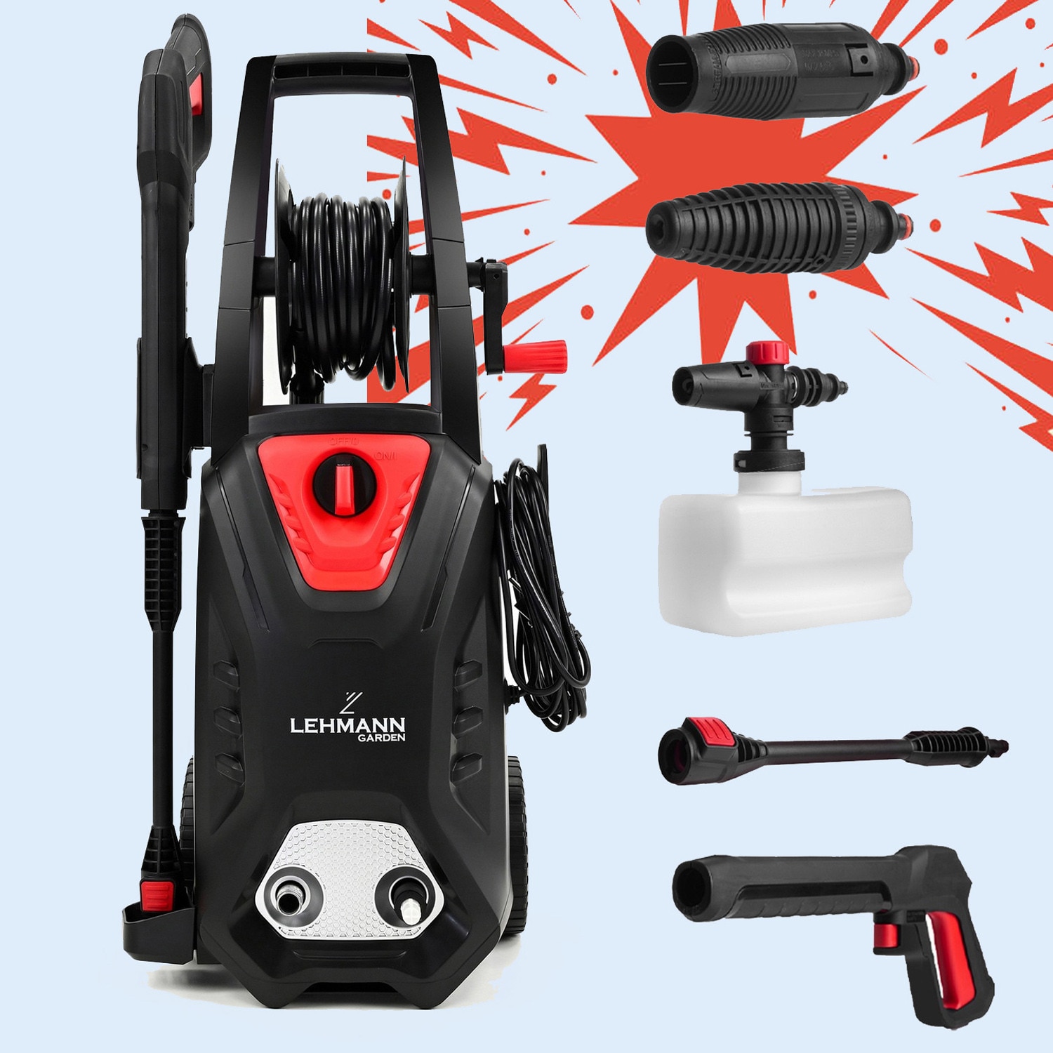 | Functii | Ajustabil Roti Design compact Buton ON/OFF Filtru de apa Rezervor detergent Constructie robusta si ergonomica Maner ergonomic Cablu de alimentare si furtun Auto Start/Stop Blocare clapeta pistol (sistem siguranta) Furtun cu tambur integrat |
