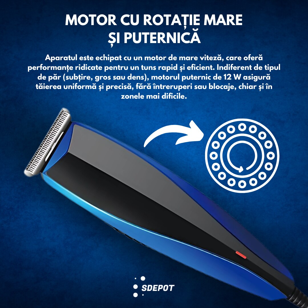 Aparatul este echipat cu un motor de mare viteza, care ofera performante ridicate pentru un tuns rapid si eficient. Indiferent de tipul de par (subtire, gros sau dens), motorul puternic de 12 W asigura taierea uniforma si precisa, fara intreruperi sau blocaje, chiar si in zonele mai dificile.