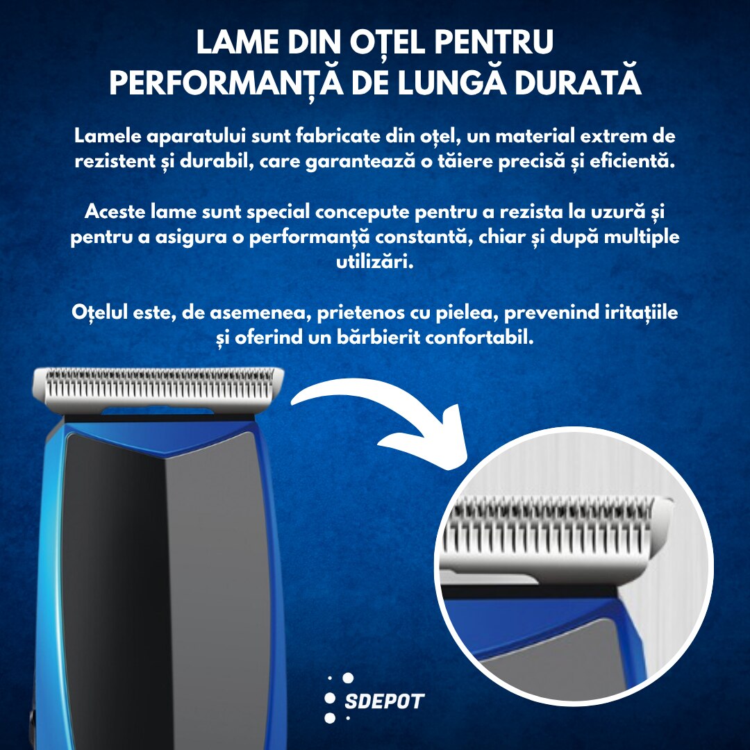 Aparatul de tuns SDEPOT® este solutia perfecta pentru barbatii care doresc un aparat de tuns versatil, puternic si de inalta performanta. Ideal pentru utilizare casnica si profesionala, acest aparat ofera rezultate impecabile in tunderea, detalierea, conturarea si filarea barbii, parului si a altor zone de pe corp. Cu un motor puternic, lame din otel titan si un design ergonomic, trimmerul SDEPOT® este alegerea ideala pentru cei care isi doresc un aparat fiabil, durabil si usor de folosit.