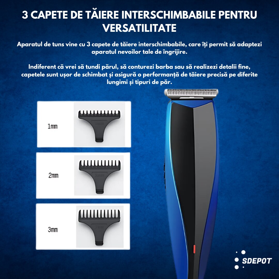 Aparatul de tuns SDEPOT® vine cu 3 capete de taiere interschimbabile, care iti permit sa adaptezi aparatul nevoilor tale de ingrijire. Indiferent ca vrei sa tundi parul, sa conturezi barba sau sa realizezi detalii fine, capetele sunt usor de schimbat si asigura o performanta de taiere precisa pe diferite lungimi si tipuri de par.