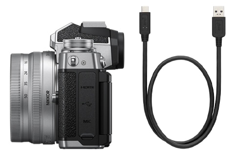 Puteti sa incarcati (cand aparatul foto este oprit) sau sa alimentati aparatul foto Z fc prin USB⁶. Este convenabil atunci cand doriti sa fotografiati mai mult timp in interior sau in timp ce efectuati o inregistrare video secventiala.