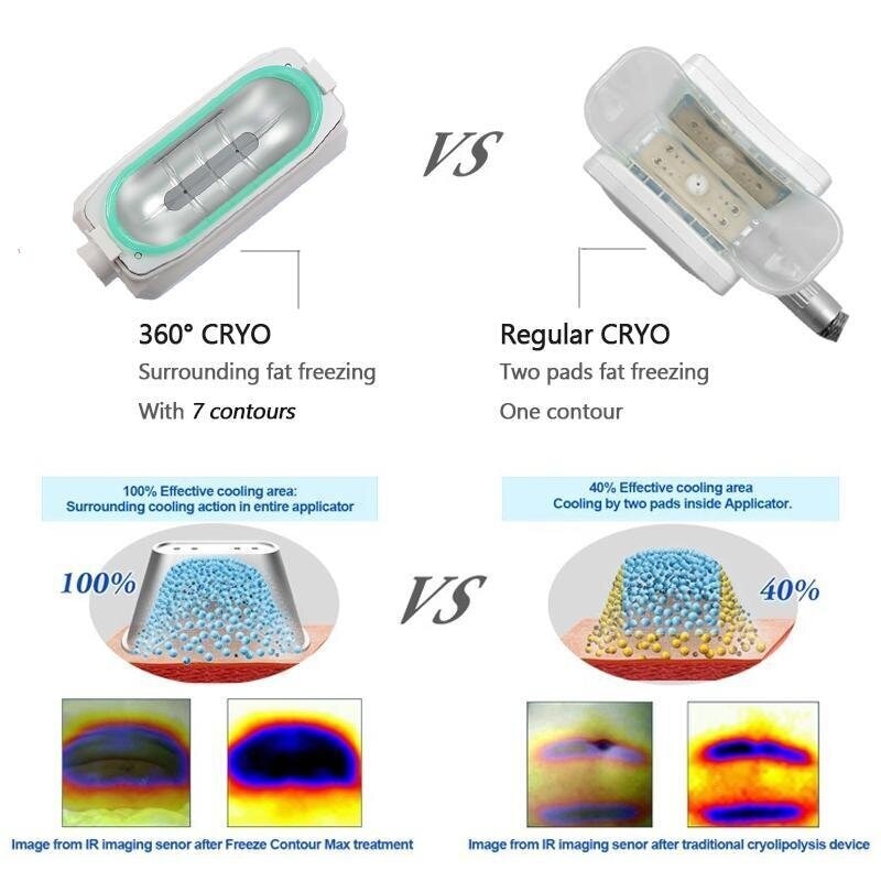 Fata de criolipoliza traditionala, unde elementele de racire sunt amplasate numai pe doua laturi ale zonei tratate, un aplicator la 360° asigura o racire uniforma din toate unghiurile. Aceasta tehnica asigura eficienta procedurii si poate fi echivalata cu 2-3 proceduri realizate cu un aparat traditional de criolipoliza.