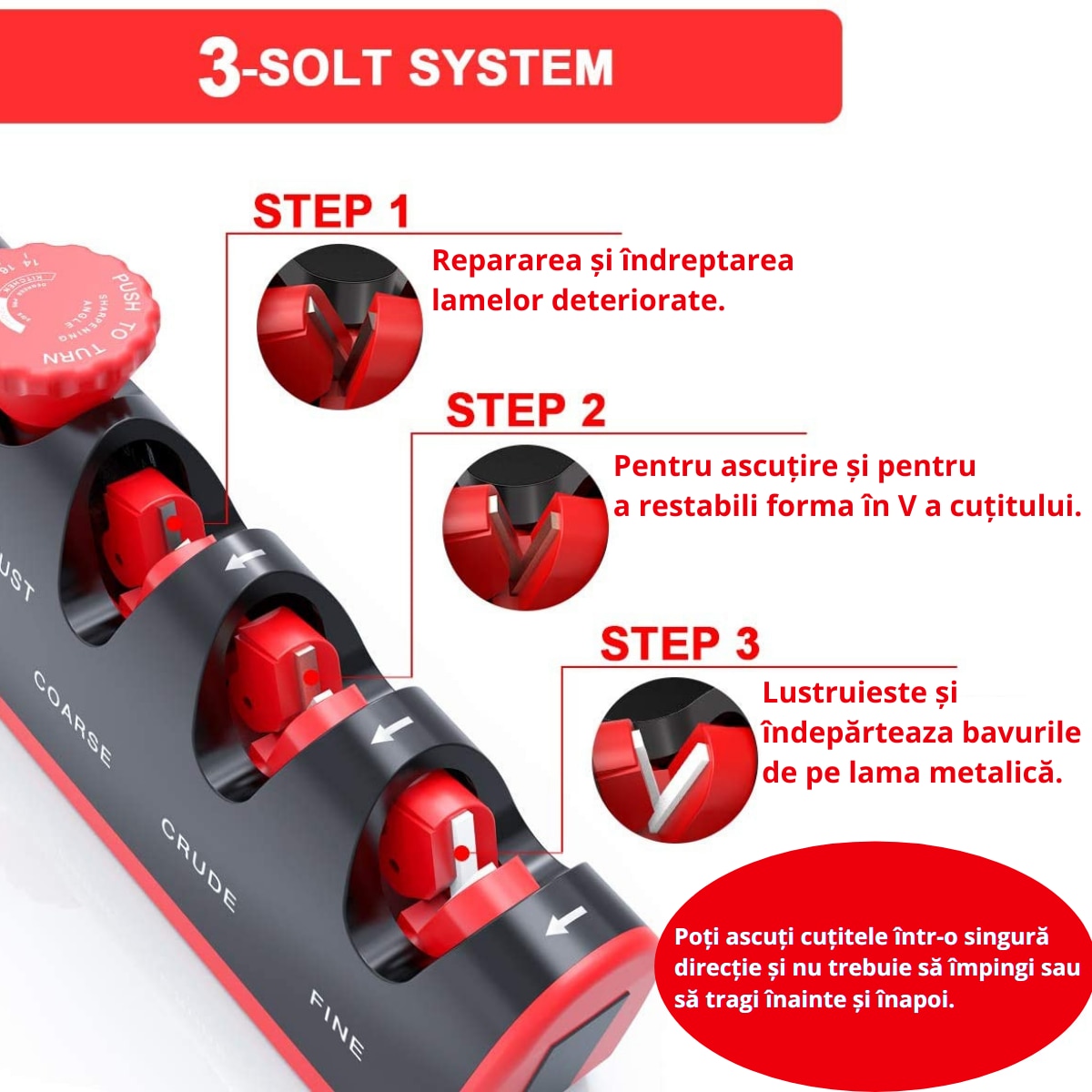 Ascutitorul profesional este usor de utilizat, punand cutitul in fiecare dintre fante si tragand de cateva ori intr-o singura directie. Poti ascuti cutitele intr-o singura directie si nu trebuie sa impingi sau sa tragi inainte si inapoi. Foarfecele de rectificat necesita gasirea unui unghi adecvat pentru a evita deteriorarea.