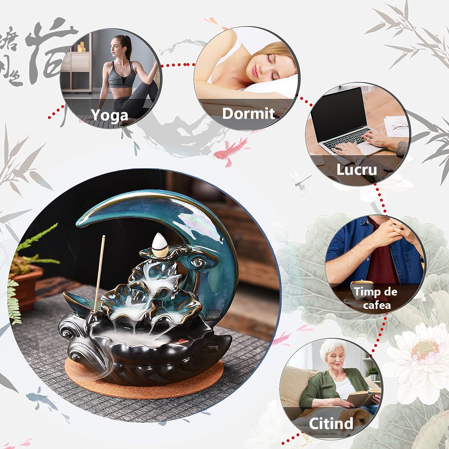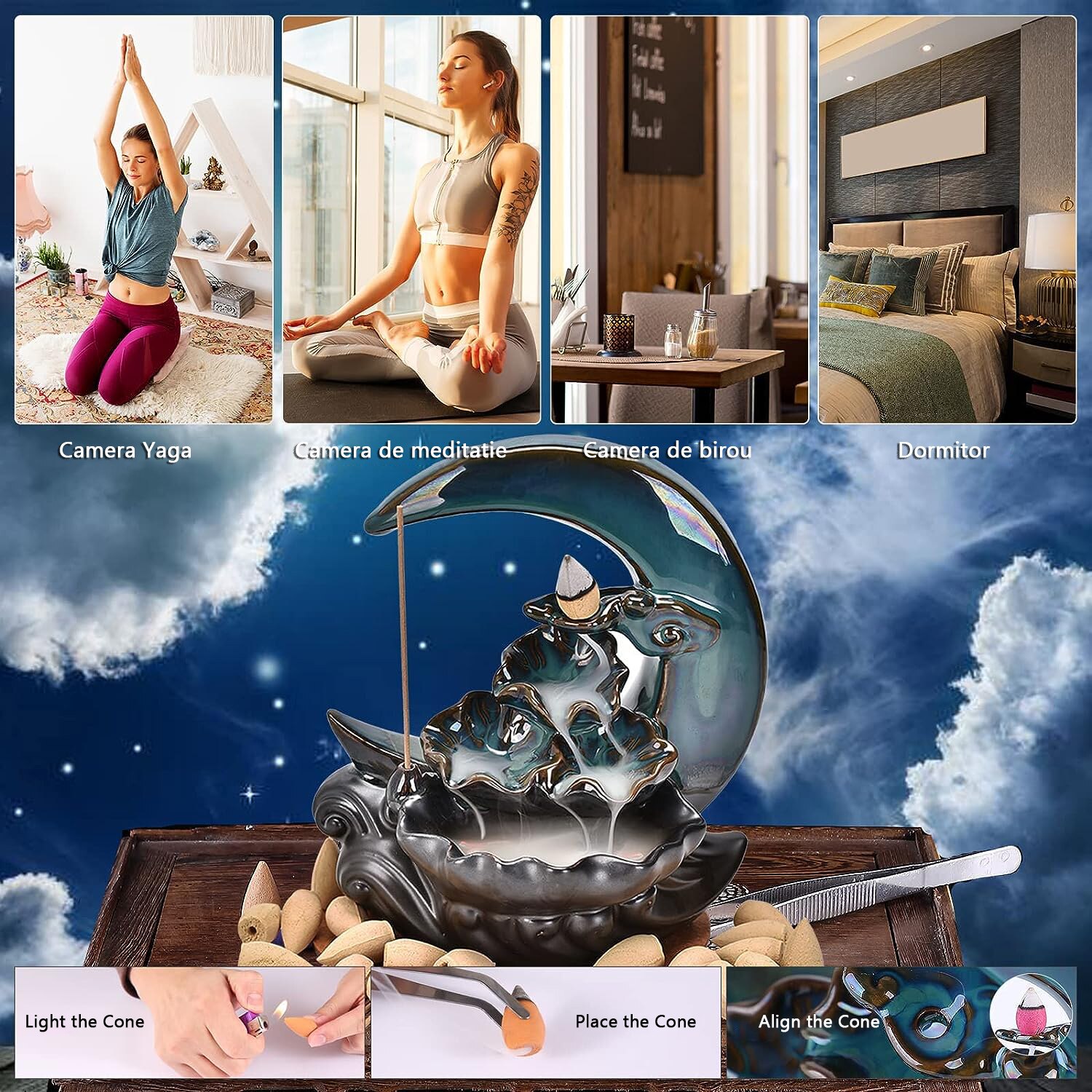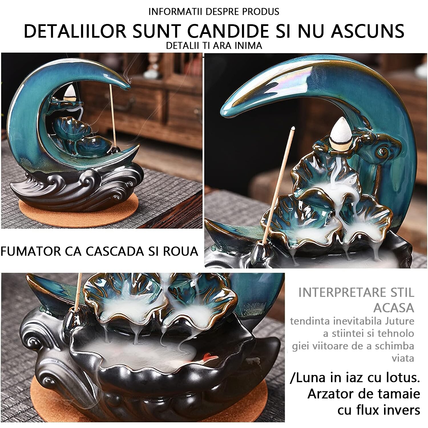 Arzator de tamaie Cascada parfumata, Amtok, Tip moon, suport conuri parfumate backflow si betisoare parfumate, aromaterapie, ceramica