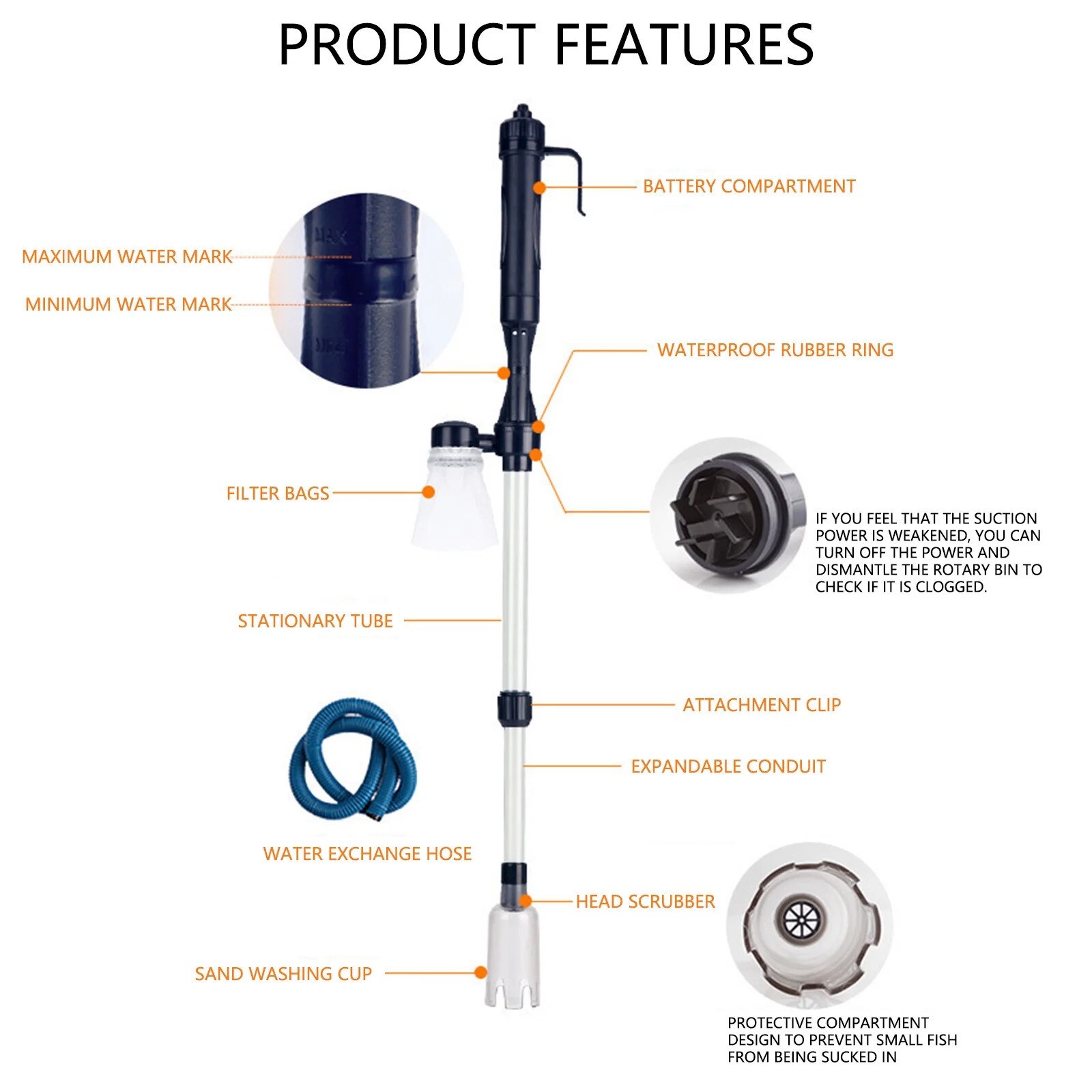Aspirator electric cu sifon pentru acvariu 4 în 1, pentru curățarea pietrișului, schimbător de apă, spălare și nisip. Caracteristici: Culoare: Negru. Dimensiune produs: 41,5-83,5 cm / 16,3-32,8 in. Dimensiune ambalare: 30 cm x 12 cm x 6 cm / 11,81 x 4,72 x 2,36 in. Greutate brută: 365 g / 0,80 lb. Greutate netă: 365 g / 0,80 lb. Caracteristici: Schimbarea apei, spălarea nisipului, filtrarea apei, aspirarea gunoiului de grajd, perierea acvariului, lopata nisipului. Tensiune de funcționare: 110 V-220 V. Descrierea produsului: 【Aspirator cu sifon 4 în 1 pentru acvariu】 Aspiratorul electric cu sifon pentru acvariu 4 în 1 poate completa eficient schimbarea apei, spălarea nisipului, filtrarea apei, aspirarea gunoiului de grajd, perierea acvariului, lopata nisipului. 4 accesorii diferite pot fi conectate atunci când se lucrează pentru diferite funcții, nu este nevoie să cumpărați alte unelte, convenabil și eficient decât sifonul manual, Vă ajută să economisiți timp și energie! 【Pompă de aspirație impermeabilă, mai sigură și mai puternică】 Curățător electric de pietriș pentru acvariu Echipat cu un motor puternic și silențios al pompei, funcționează mai sigur, fără zgomot. Iar aspirația este puternică pentru a vă ajuta să schimbați rapid apa, să aspirați gunoiul de pește și să spălați nisipul, Este un companion excelent în viața de zi cu zi! 【Material de înaltă calitate】 Fabricat din materiale de înaltă calitate pentru a asigura durabilitate și longevitate. Nu ruginește și nu îmbătrânește. 【Curățare pentru toate tipurile de acvarii】 Curățătorul de pietriș pentru acvariu este echipat cu o tijă telescopică și un furtun de apă extins de 1,5 m, potrivit pentru adâncimi ale apei de la 4 inch la 25 inch, astfel încât puteți ajusta lungimea în funcție de dimensiunea sau nivelul apei din acvariu, curățând acvariul mai ușor! 【Notă】 Pentru a menține igiena acvariului dvs., este important să spălați bine uneltele de curățare după fiecare utilizare. Cu acest kit de curățare convenabil, vă puteți menține acvariul în stare perfectă și puteți oferi un mediu sigur și sănătos pentru peștii dvs. Conținutul pachetului: 1x Aspirator cu sifon pentru curățarea pietrișului pentru acvariu Material: Plastic Măturare, Aspirator electric pentru pietriș pentru acvariu 4 în 1 Aspirator automat cu sifon pentru schimbătorul de apă Spălare nisip Instrumente de curățare a acvariului, Produse de curățare potrivite pentru bucătărie, casă, sufragerie, interior, birou Depozitare ușoară, curățare ușoară, produse de curățare, produse de curățare pentru casă, curățenie, produse de curățare, curățenie auto Cadoul perfect pentru Ziua Tatălui, Ziua Mamei, încălzirea casei pentru o casă nouă