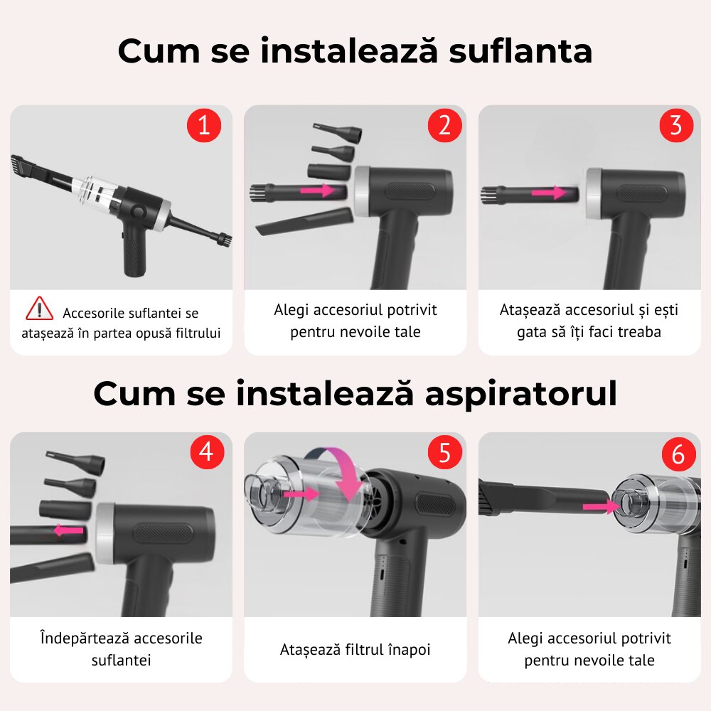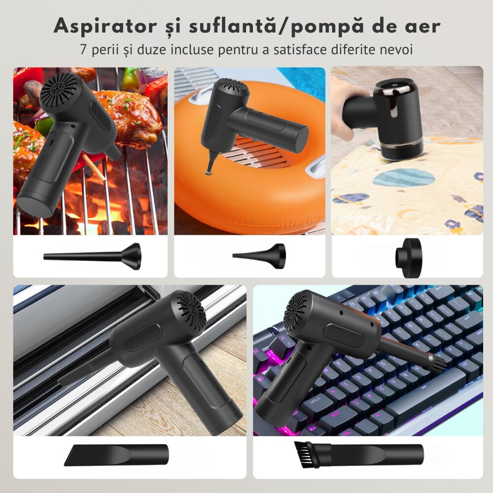 Accesorii inteligente: Include diverse duze pentru aspiratie si suflare, oferind o curatare completa pentru orice suprafata.