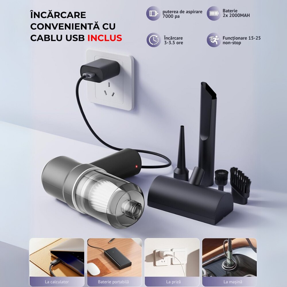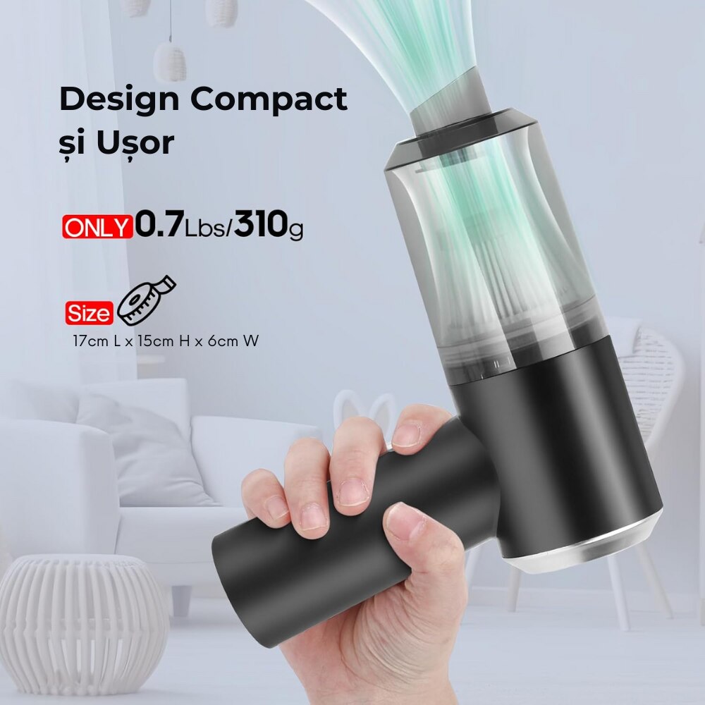 Raspunde nevoilor tale zilnice cu usurinta: Iti doresti un spatiu curat si organizat? Acest aspirator portabil este aliatul perfect, facand curatenia de zi cu zi mai rapida si mai eficienta ca niciodata.