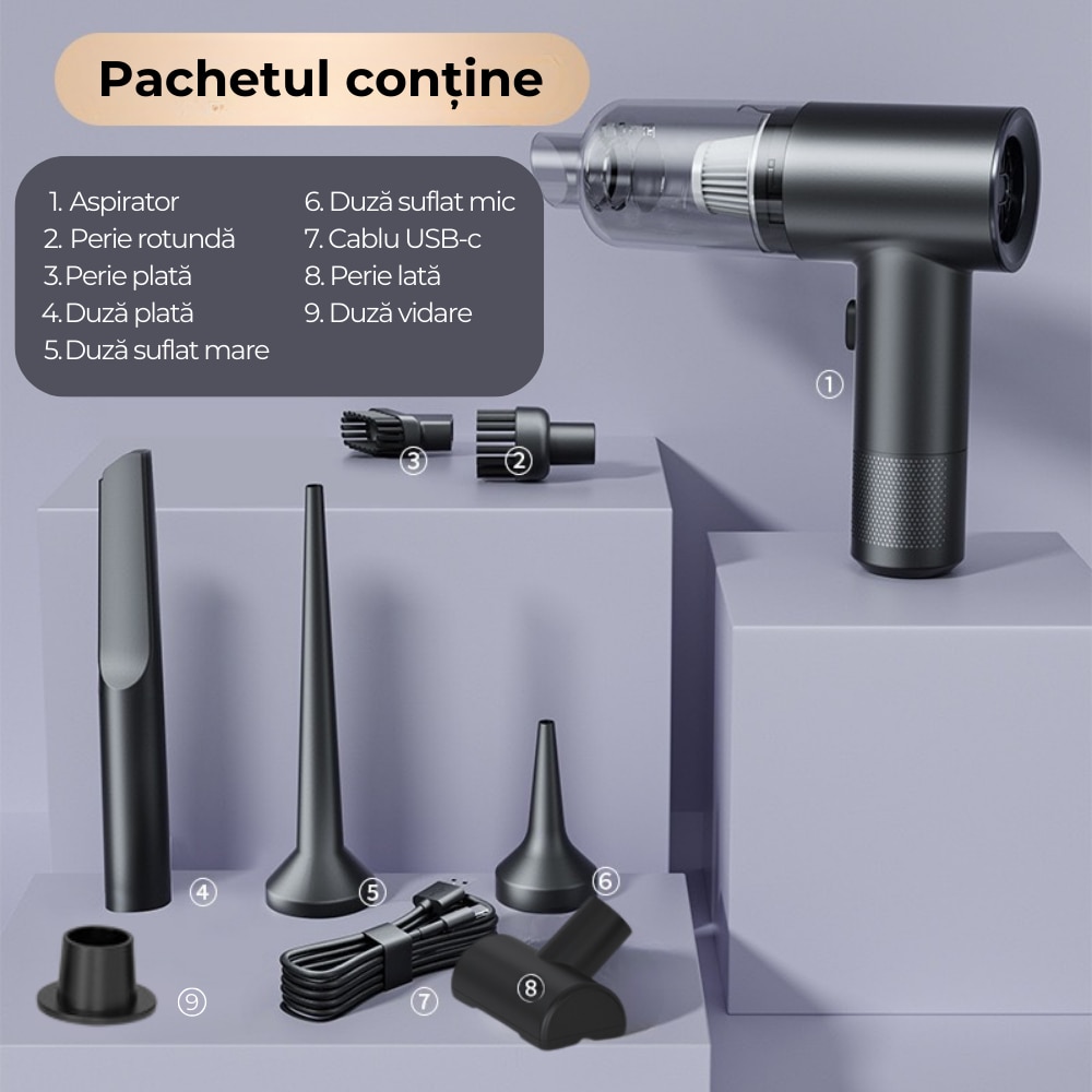 Imagineaza-ti o masina curata, o casa organizata si birouri impecabile- totul cu un singur dispozitiv. Nu mai pierde timpul cu echipamente greoaie sau complicate! Acest aspirator portabil este solutia moderna si eficienta pe care ai asteptat-o.