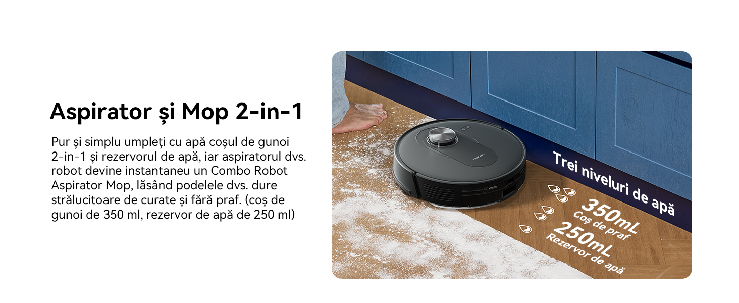 Pur si simplu umpleti recipientul de praf 2 in 1 si rezervorul de apa cu apa, iar robotul dvs. aspirator devine instantaneu un robot aspirator si mop, care va lasa podelele dure stralucitoare curate si fara praf. (recipient de praf de 350 ml, rezervor de apa de 250 ml)