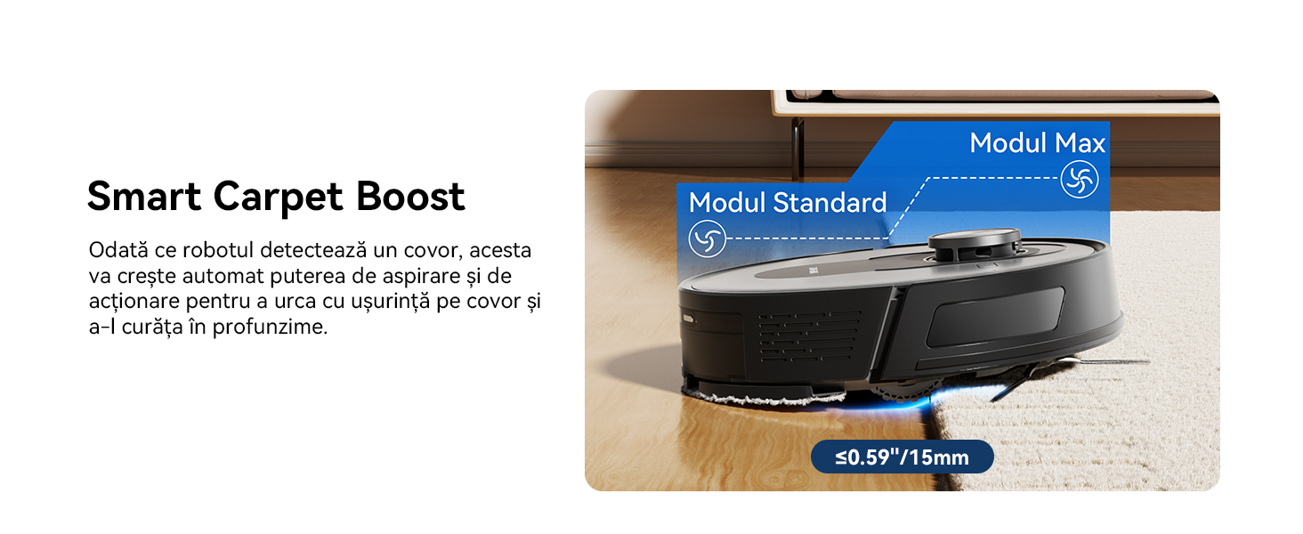 De indata ce robotul detecteaza un covor, acesta creste automat puterea de aspiratie si de antrenare pentru a urca fara efort pe covor si a-l curata temeinic.