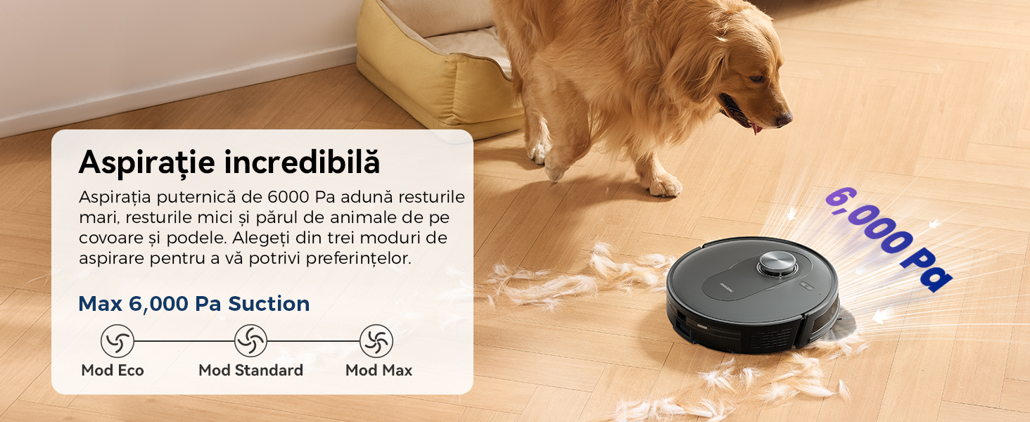 Puterea de aspirare puternica de 6000 Pa preia resturile mari si mici, precum si parul de animale de pe covoare si podele.Alegeti dintre trei moduri de aspiratie pentru a se potrivi preferintelor dvs.