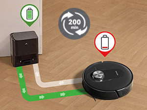 Cand nivelul bateriei este scazut, robotul se intoarce automat la statia de incarcare, se reincarca si continua curatarea de unde a ramas.