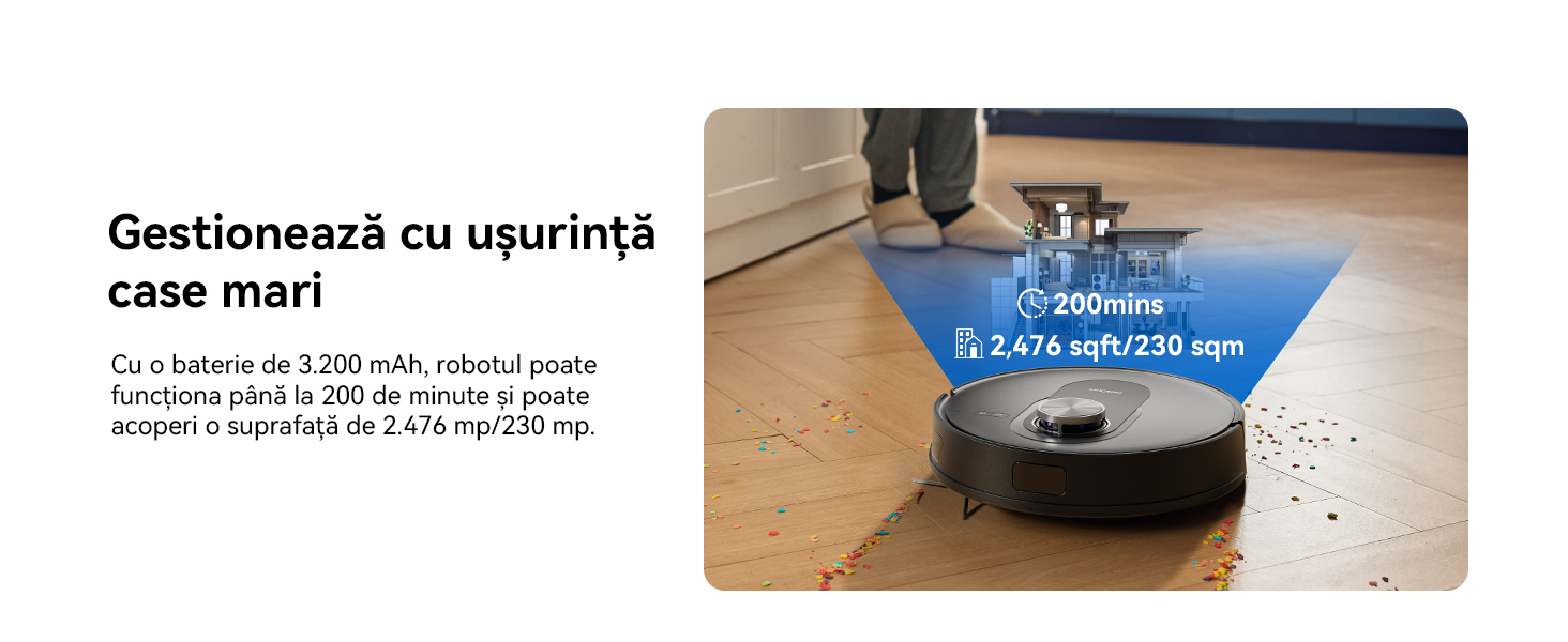 Cu o capacitate a bateriei de 3.200 mAh, robotul poate functiona pana la 200 de minute si poate acoperi o suprafata de 230 m².