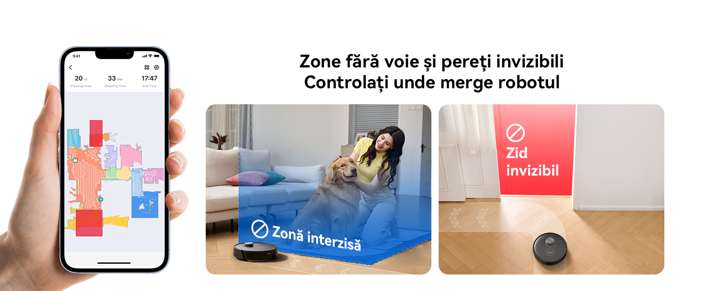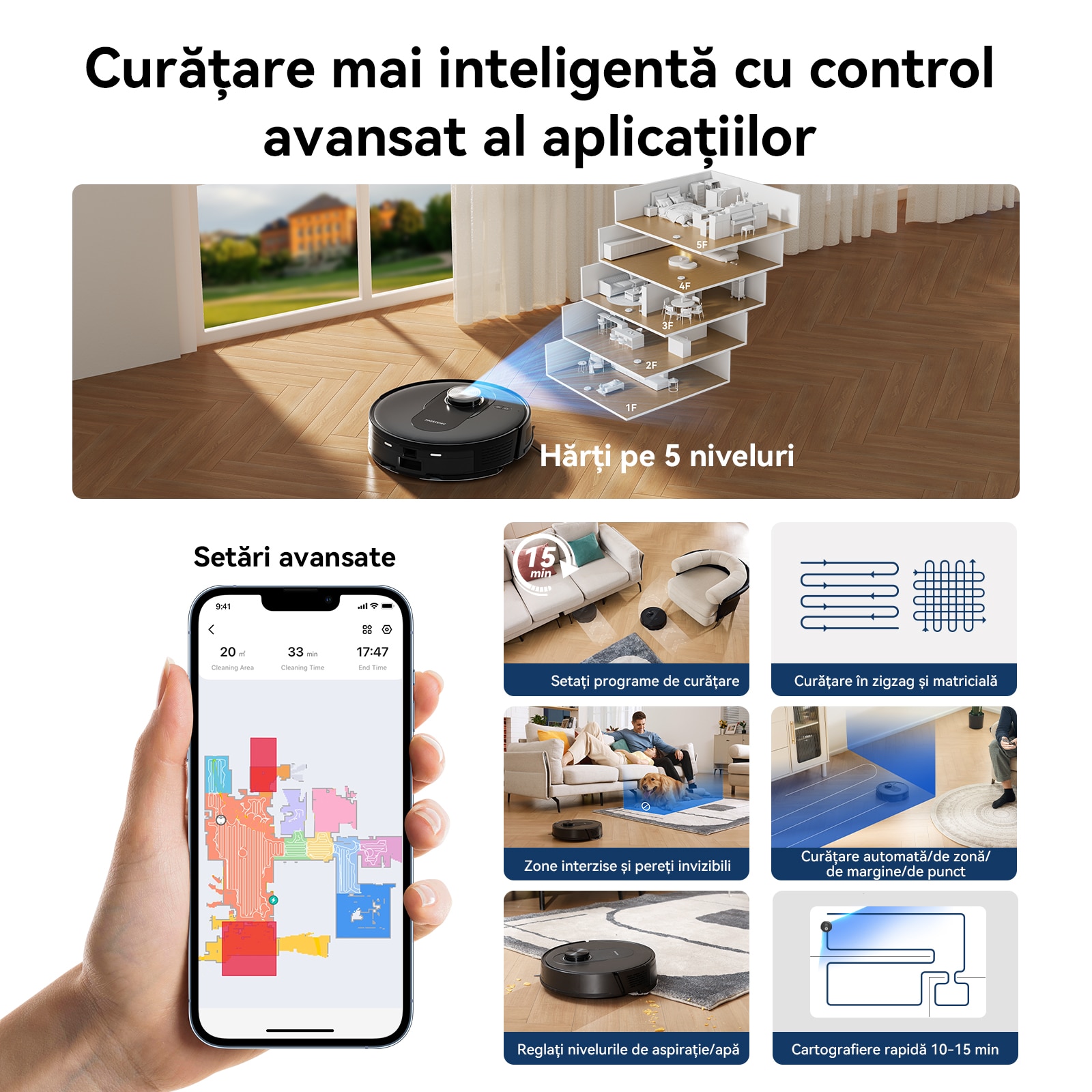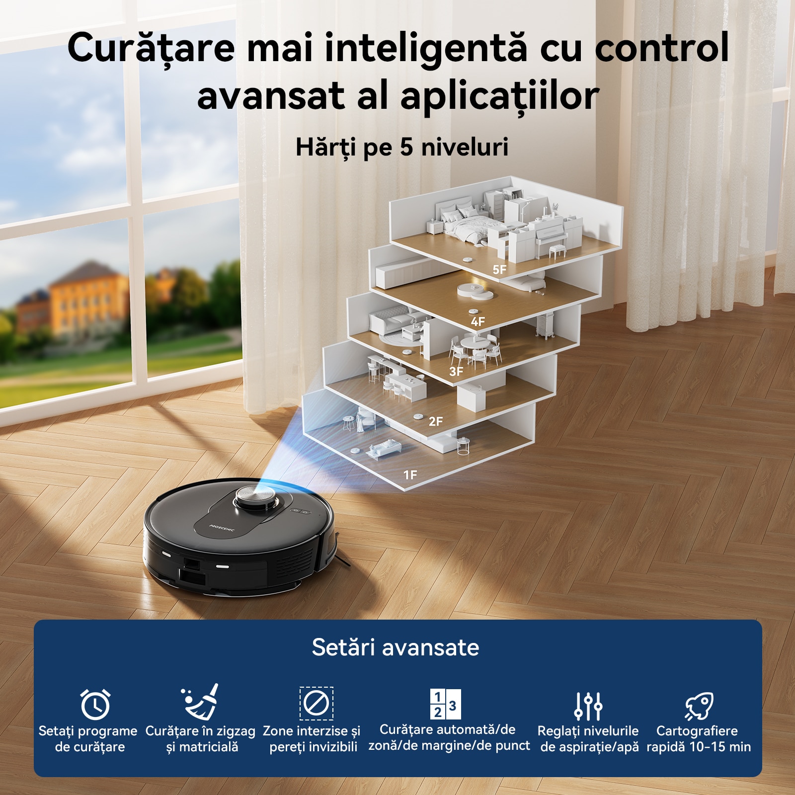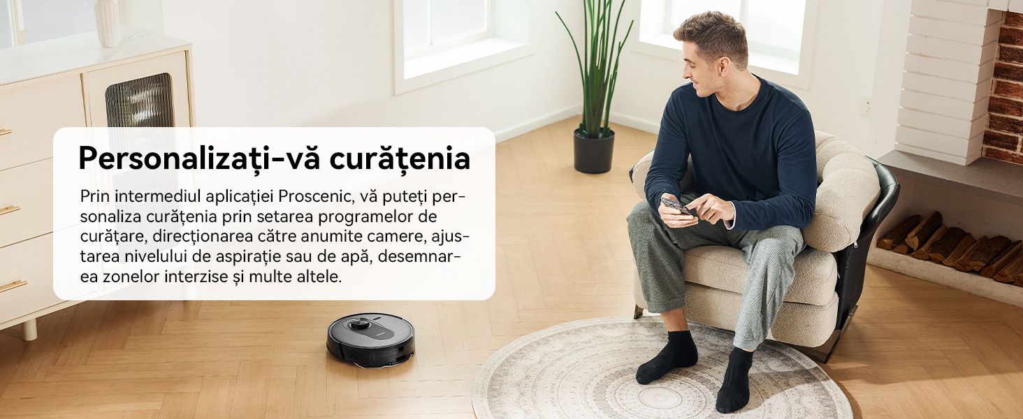Folosind aplicatia Proscenic, va puteti personaliza curatarea setand programe de curatare, tintind anumite camere, ajustand nivelurile de aspiratie sau de apa, setand zone interzise si multe altele.