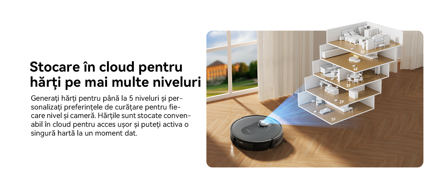 Stocare in cloud pentru harti pe mai multe niveluri Creeaza harti pentru pana la 5 niveluri si ajusteaza setarile de curatare pentru fiecare nivel si fiecare camera.