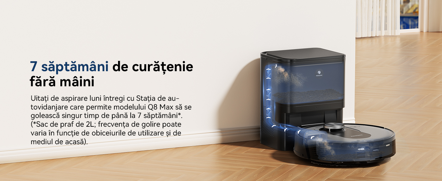Uitati sa aspirati luni de zile cu statia de autogolire care permite Q8 Max Robot de aspirare sa se goleasca singur timp de pana la 7 saptamani*. (*Sac de praf de 3L; frecventa de golire poate varia in functie de obiceiurile de utilizare si mediul de viata.)Gramada de colectare a prafului
