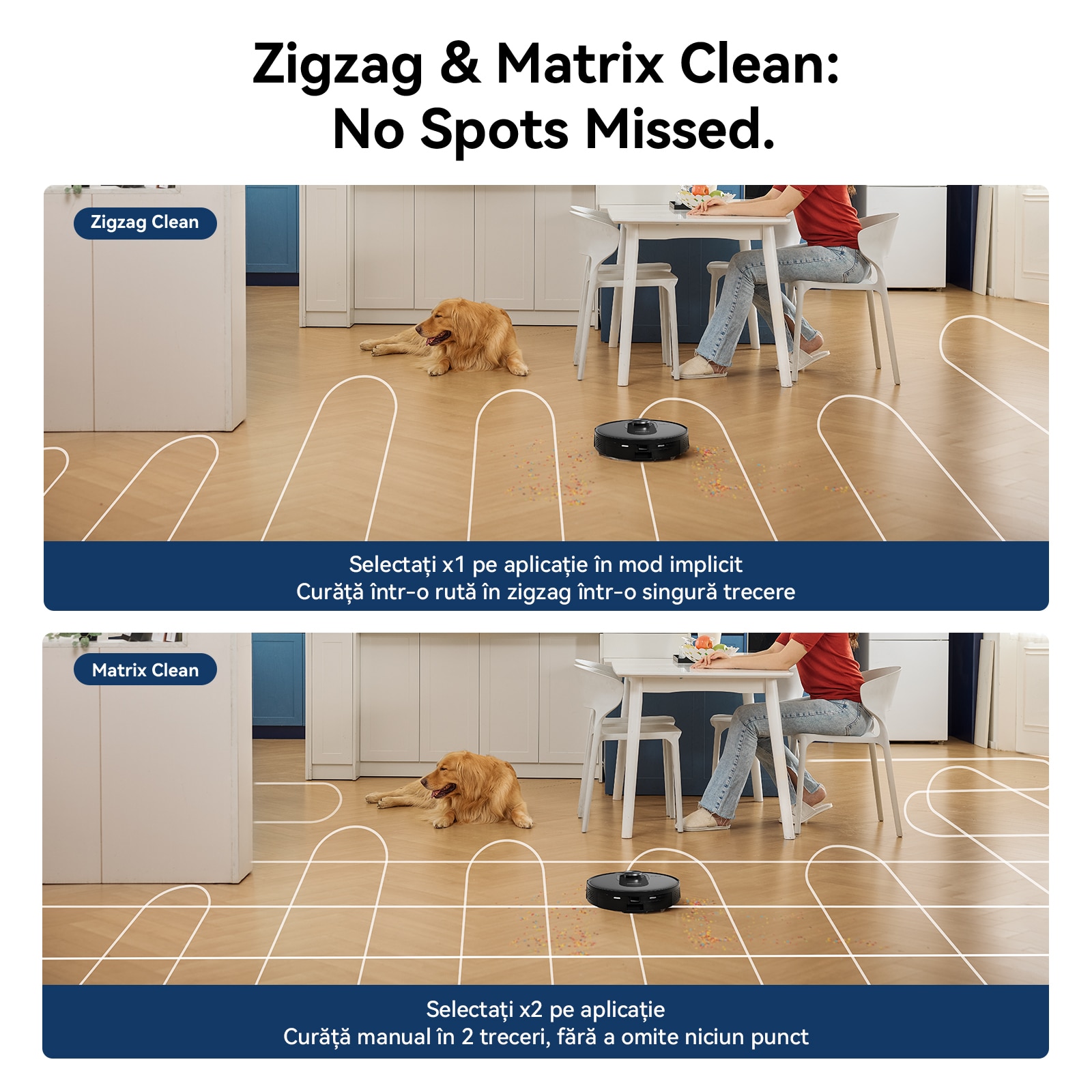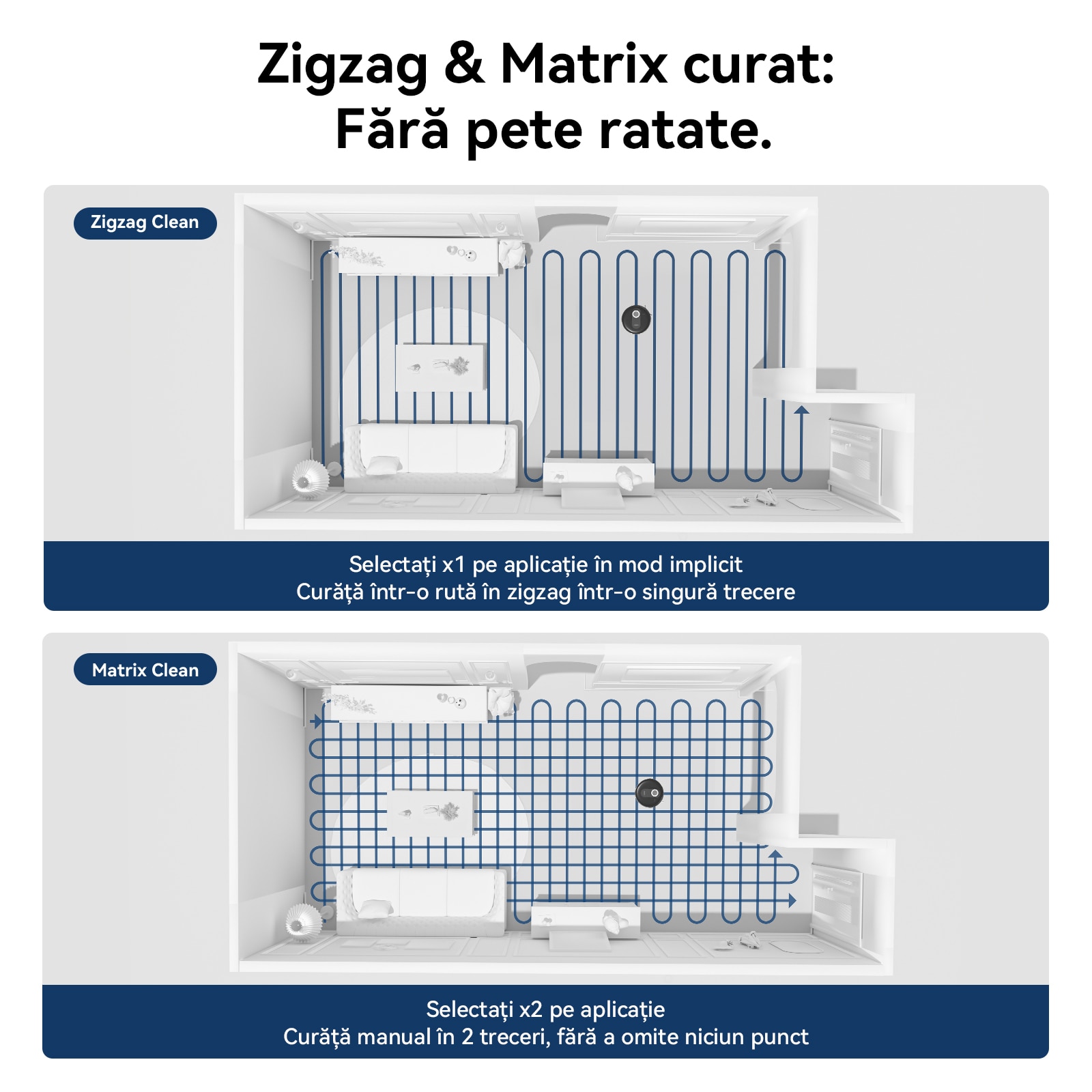 Curatare in zig-zag Selectat implicit in aplicatie x1 Curata intr-un traseu in zig-zag intr-o singura trecere Curatare matrice Selectat manual in aplicatie x2 Curata in doua treceri, niciun loc nu este lasat afara