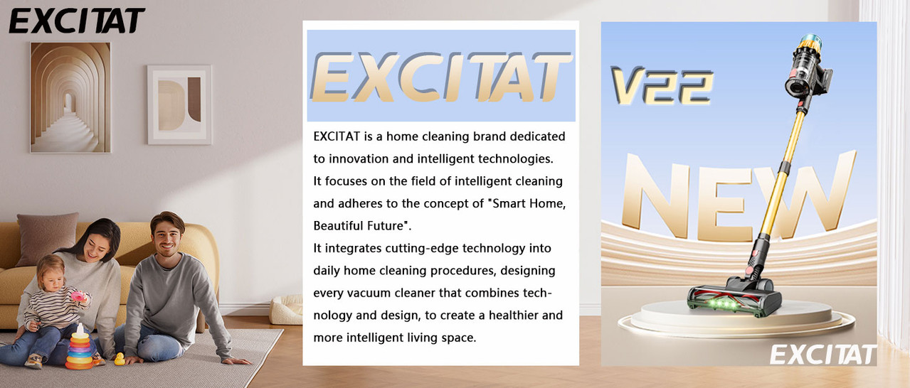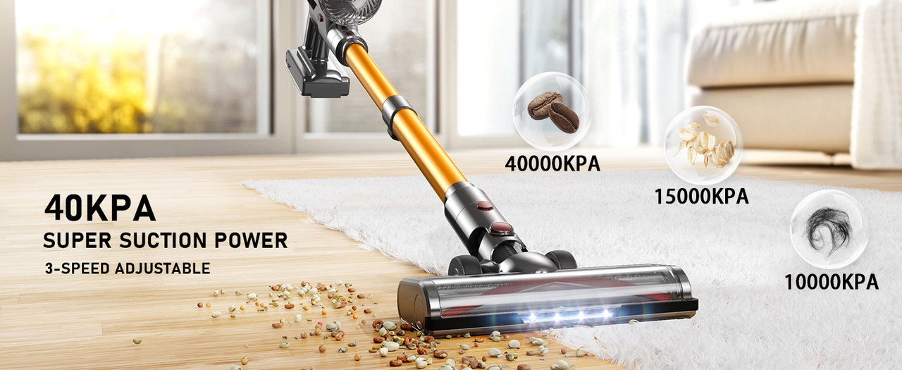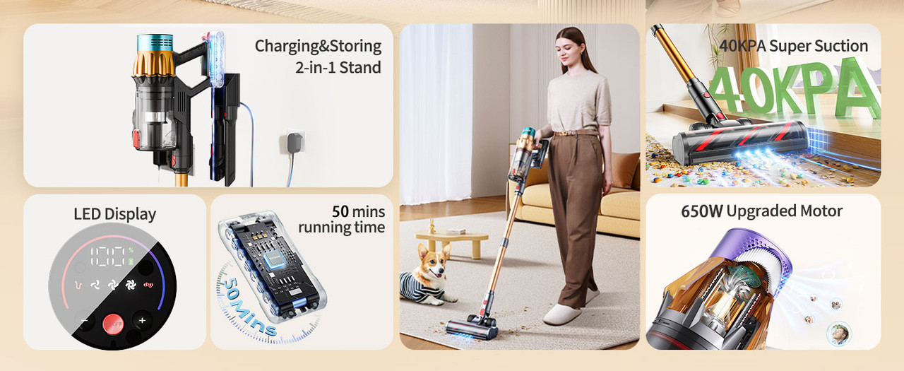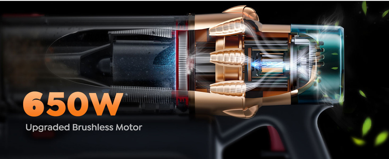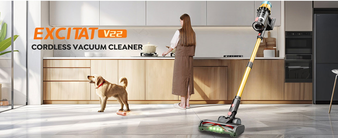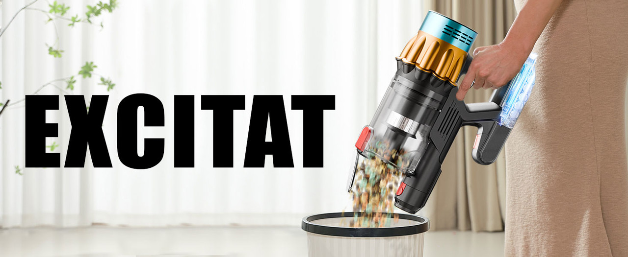 Aspirator vertical fara fir, Excitat®, functie Turbo, putere de aspirare mare, 650W, sistem filtrare ciclonic, Cu ecran tactil LED, autonomie pana la 65 min, cu cinci accesorii, Galben
