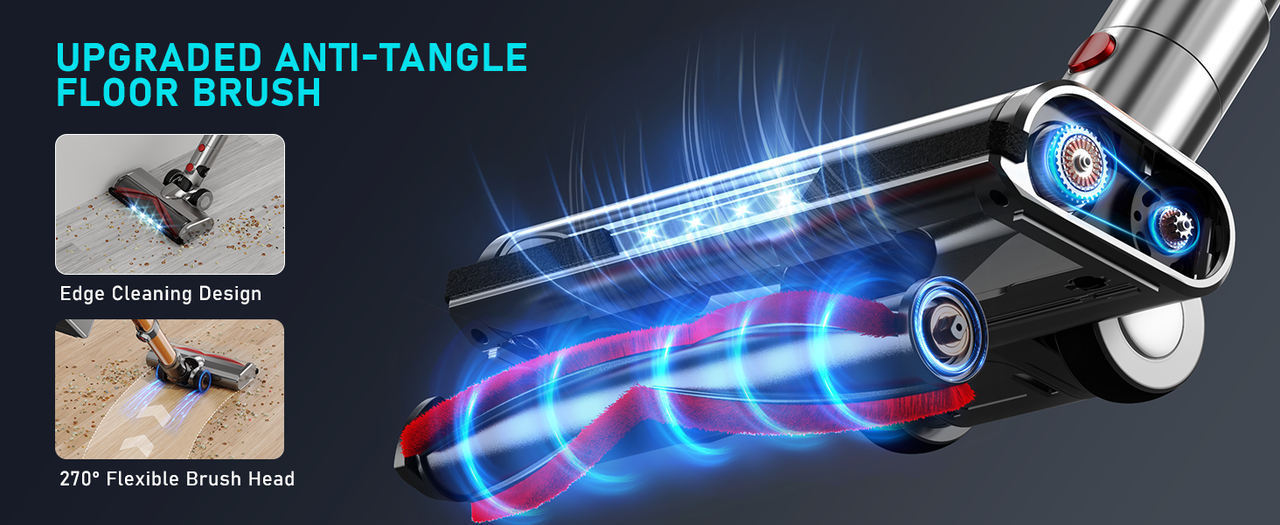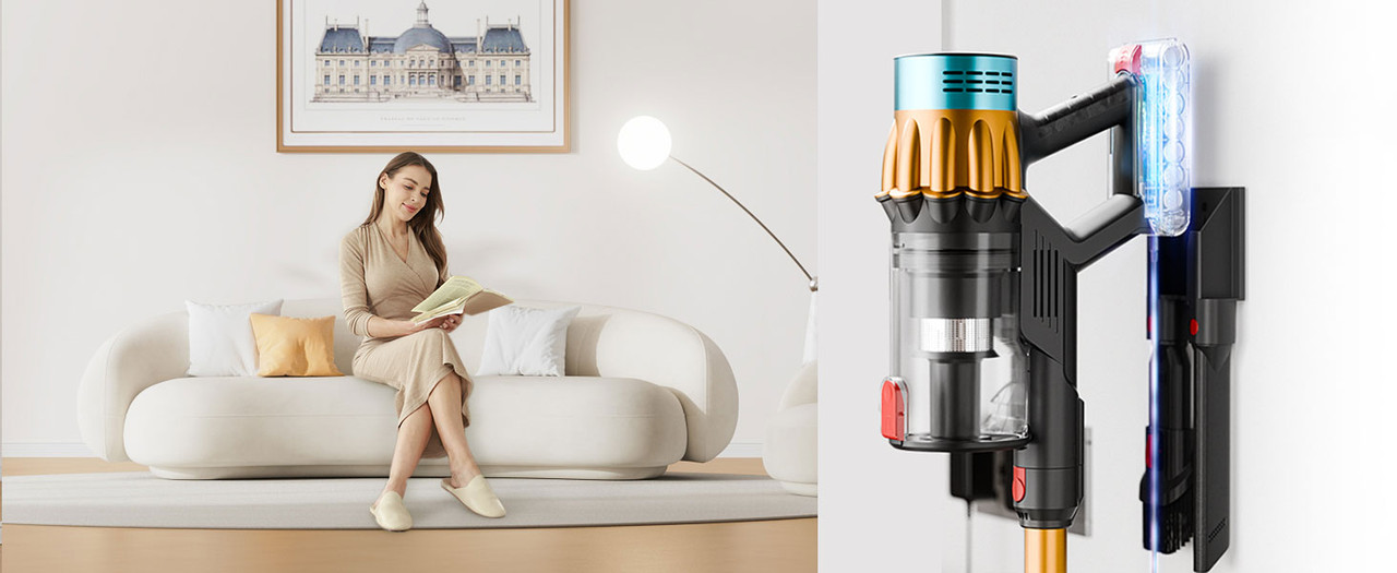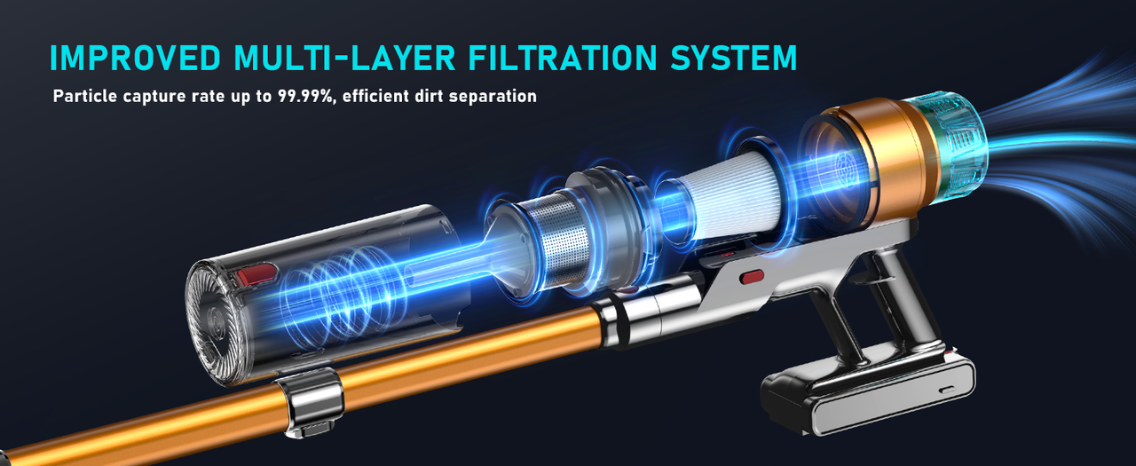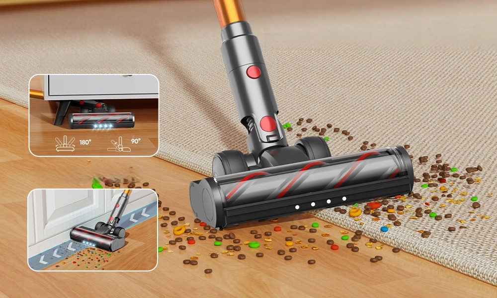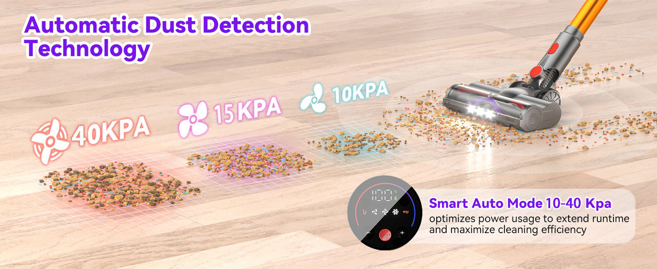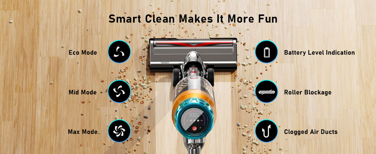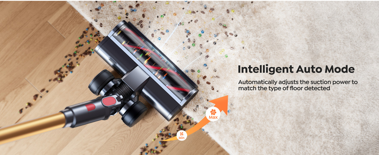 Aspirator vertical fara fir, Excitat®, functie Turbo, putere de aspirare mare, 650W, sistem filtrare ciclonic, Cu ecran tactil LED, autonomie pana la 65 min, cu cinci accesorii, Galben
