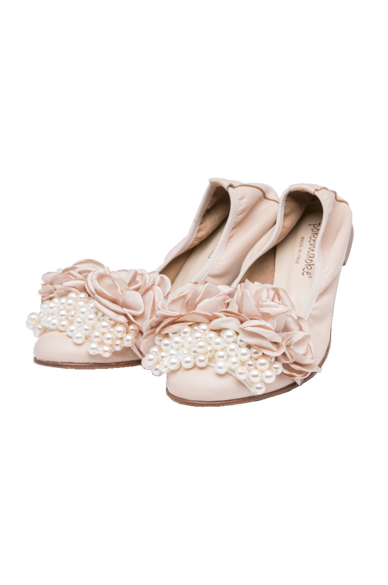 Balerini Pokemaoke din piele roz pudra cu flori matase si perle, 38