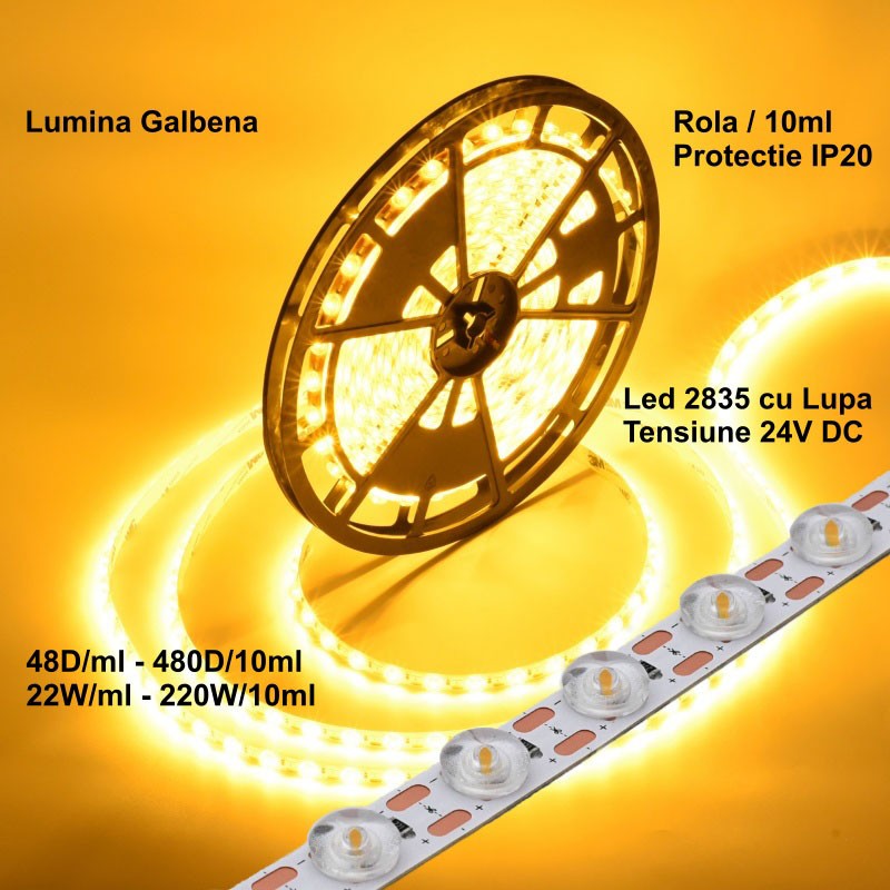 Banda LED 2835 24V 480 LED-uri 220W cu Lupa, Rola de 10m, IP20, Lumina Galbena pentru Iluminat Interior
