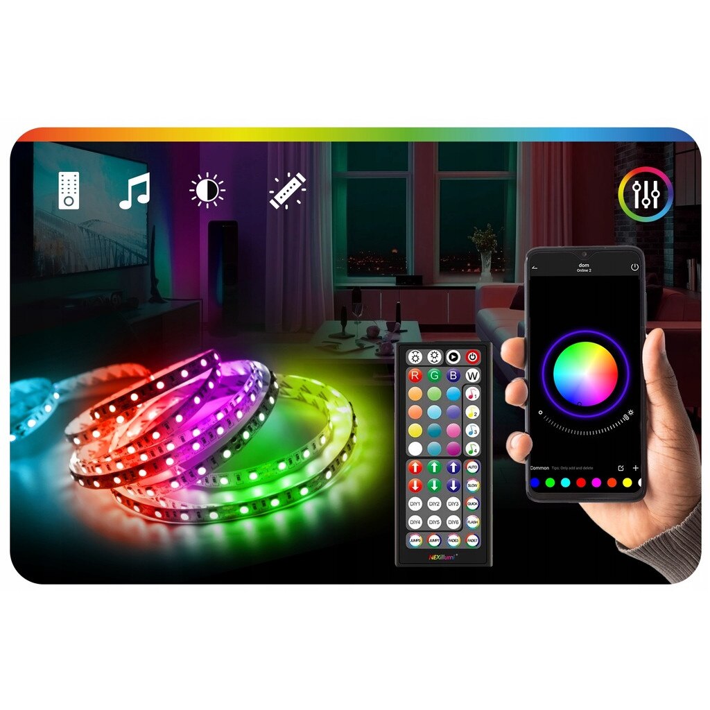 Banda LED RGB LEDRGB, 7.5m, Bluetooth, Aplicatie Mobila, Pilot, Sincronizare Muzicala, Kit 13 in 1, 12V, 5050, 195 LED-uri/m, IP20, Control Vocal