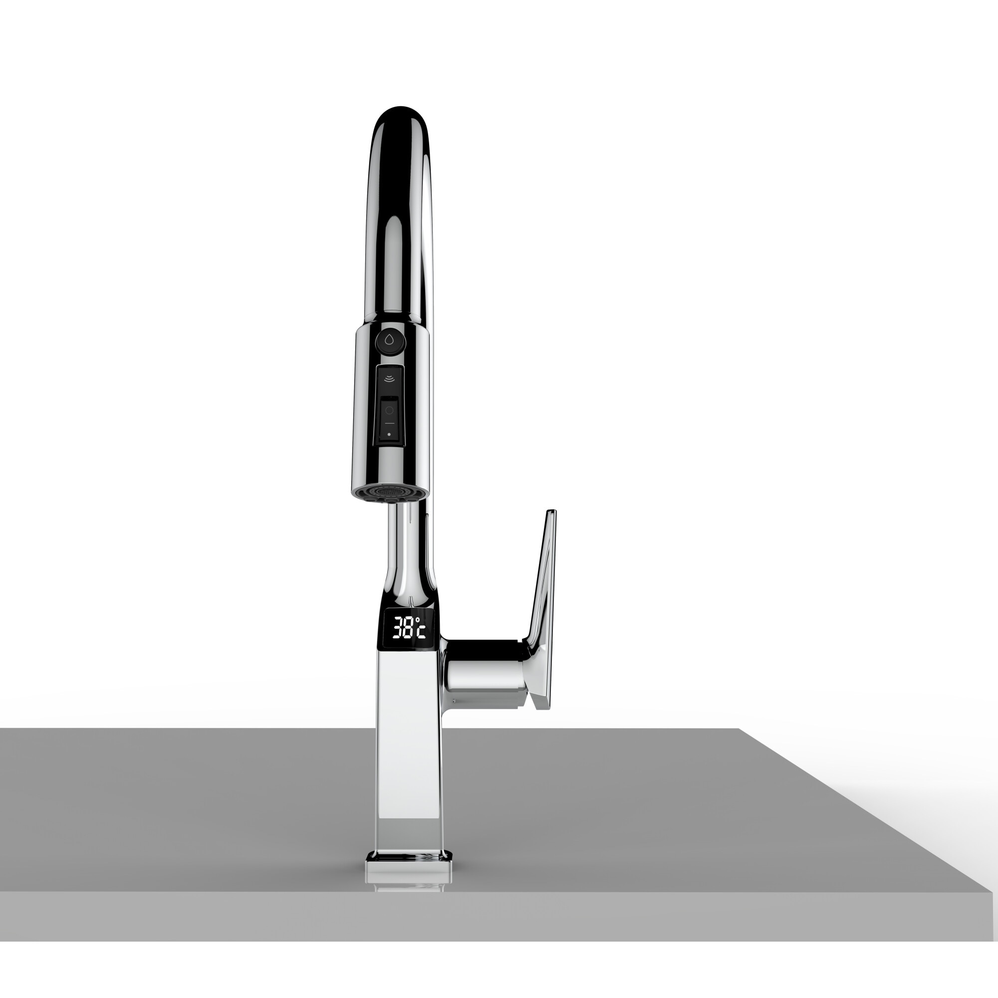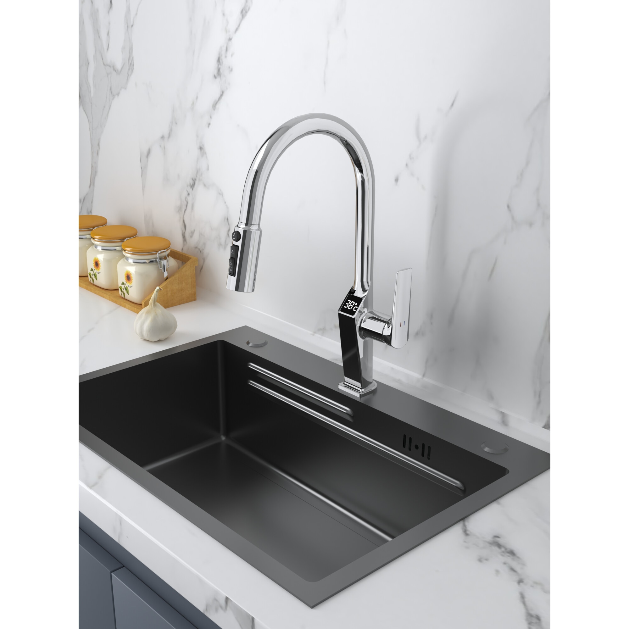 Baterie chiuveta bucatarie 3 cai cu apa filtrata Air Tone Technology®️, Inox, Ecran LCD temperatura, Pentru filtru apa, Calda si rece, Culoare Inox