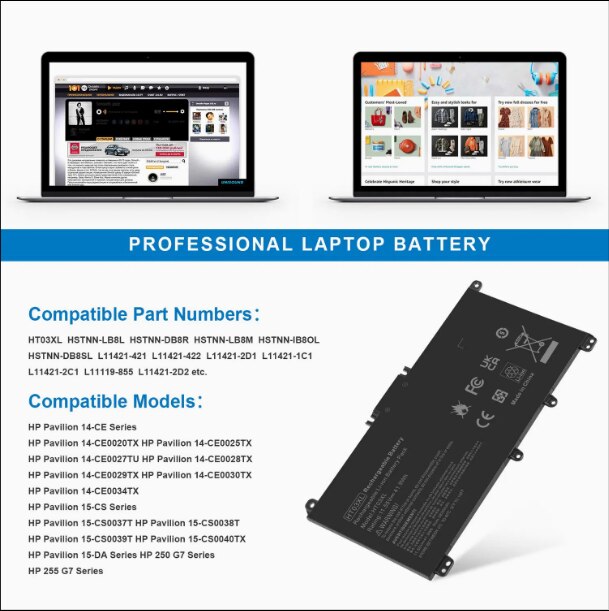 Bateria laptop HT03XL este special conceputa pentru a fi complet compatibila cu o gama larga de modele de laptopuri HP. Este ideala pentru multe laptopuri din seria HP Pavilion, cum ar fi cele din seria 14-ce, 14-cf, 14-ck, 14-cm, 14-df, 14-ma, 14q-cs, 14q-cy, 14s-cf, 14s-cr, 14-fq. De exemplu, functioneaza perfect cu modele precum 14-ce0068st, 14-cf0006dx, 14-ck0013la, 14-cm1025la, 14-df0023cl. De asemenea, este potrivit pentru unele modele convertibile HP Pavilion x360, cum ar fi 14m - dh0001dx, 14m - dh1003dx. In plus, poate fi utilizat cu laptopuri din seria HP 240 g7, 245 g7, 250 g7, 255 g7, 340s g7, 470 g7, 340 g5, 348 g5. Daca modelul dvs. de laptop HP se numara printre acestea sau are un necesar de alimentare similar, aceasta baterie este probabil o alegere excelenta.
