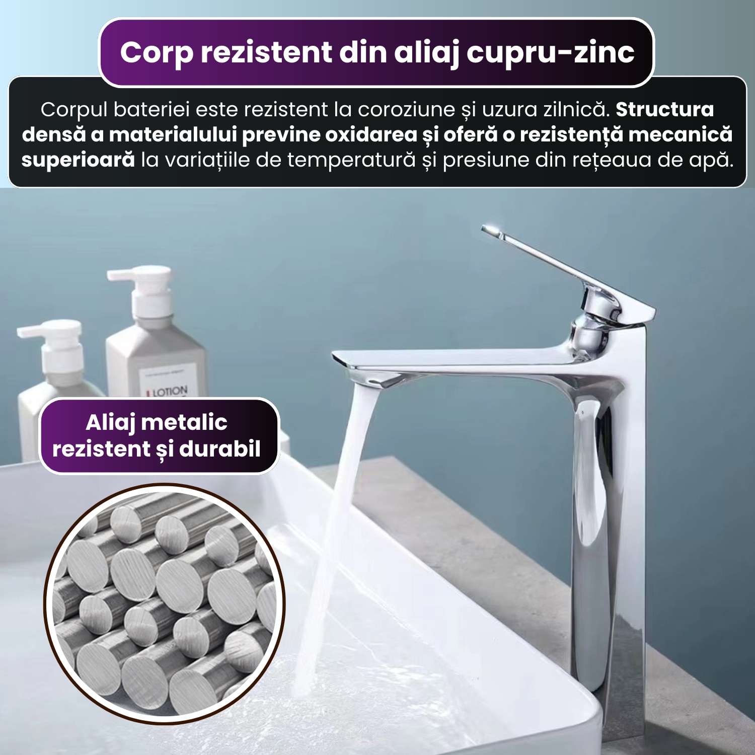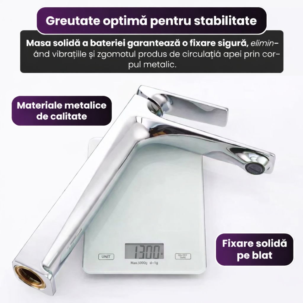 Aceasta constructie metalica garanteaza integritatea sistemului sanitar si previne aparitia fisurilor in timp, asigurand o fixare ferma pe blat.