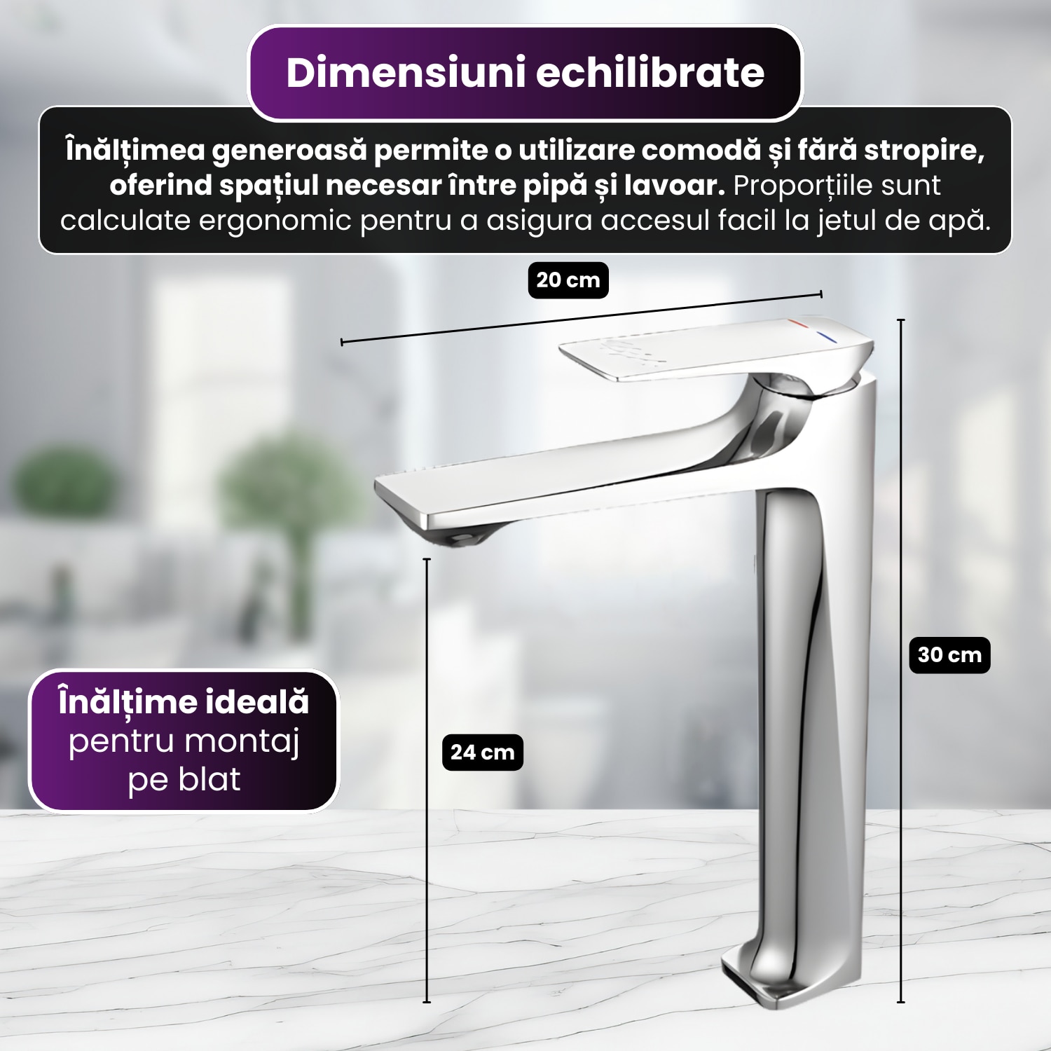 Avand o inaltime de 30 cm, bateria este dimensionata special pentru a fi instalata langa lavoare tip bol.