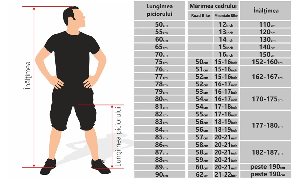 Stim ca alegerea marimii corecte a cadrului poate fi dificila, chiar si pentru biciclistii experimentati, marimea potrivita depinde de tipul de bicicleta pe care il alegeti, de inaltimea dumneavostra, de stilul pe care-l abordati si nu in ultimul rand, de preferintele pe care le aveti. Ghidul de mai sus va ofera sfaturi generale privind alegerea bicicletei potrivite, in functie de dimensiunea acesteia.