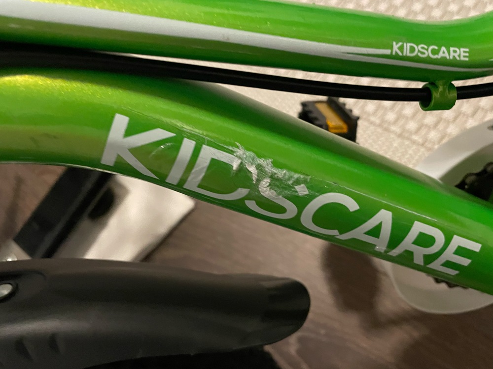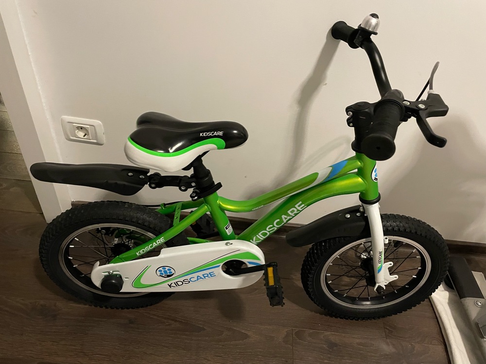 Bicicleta pentru copii 3-6 ani HappyCycles KidsCare, roti 14 inch, cu roti ajutatoare si frane pe disc, verde
