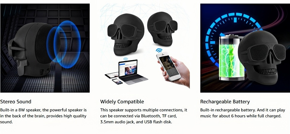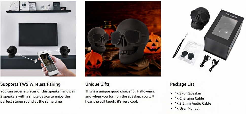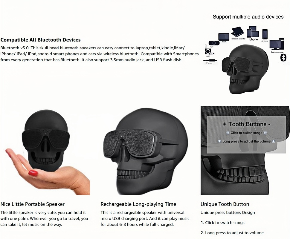 Descopera noua boxa wireless cu design craniu – combinatia perfecta intre stil indraznet si tehnologie de top. Aceasta boxa portabila impresioneaza prin Bluetooth 5.3 stabil, sunet Ultra Clear si functia TWS care iti permite sa imperechezi doua dispozitive pentru un stereo real. Fie ca esti la plaja, la birou sau acasa, boxa wireless se conecteaza instant la telefon si ofera pana la 8 ore de muzica neintrerupta. Rezistenta la apa si greutatea de numai 420 g fac din aceasta boxa portabila companionul ideal pentru orice aventura.