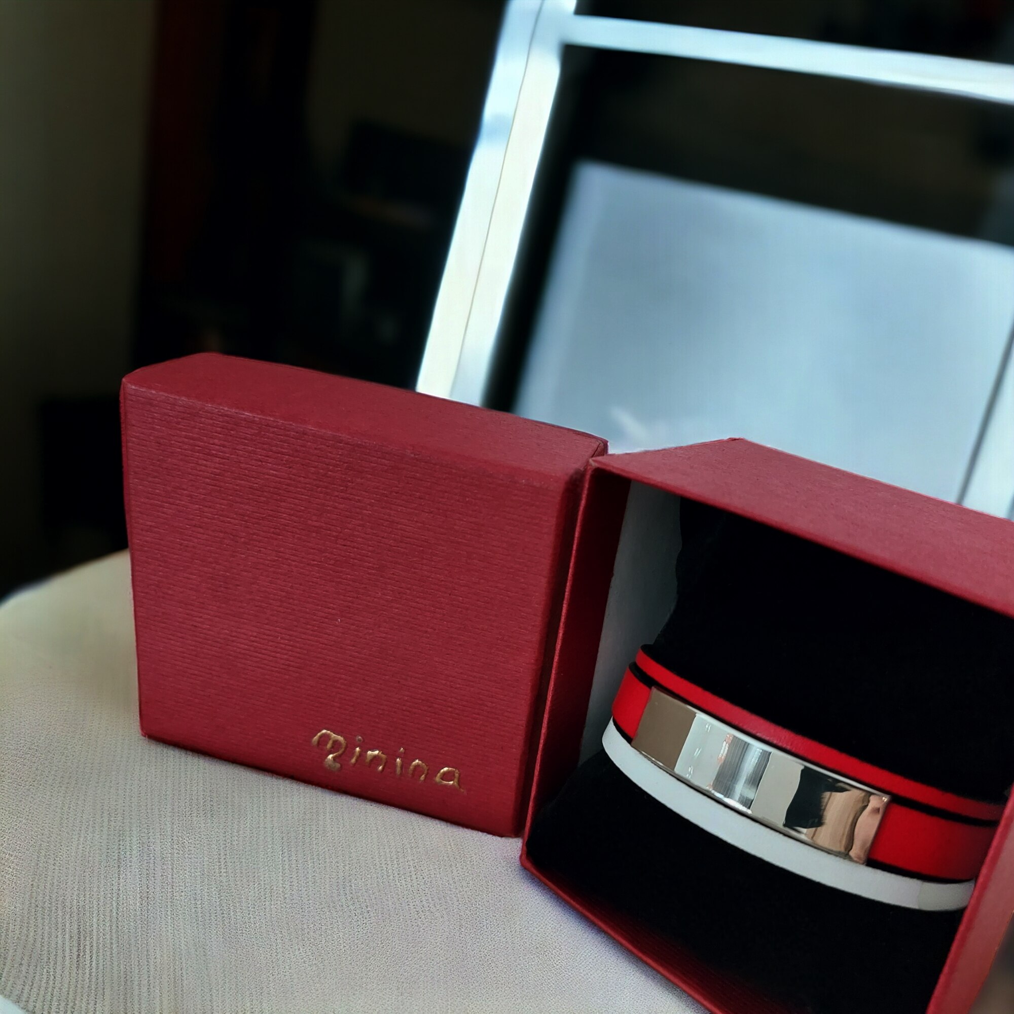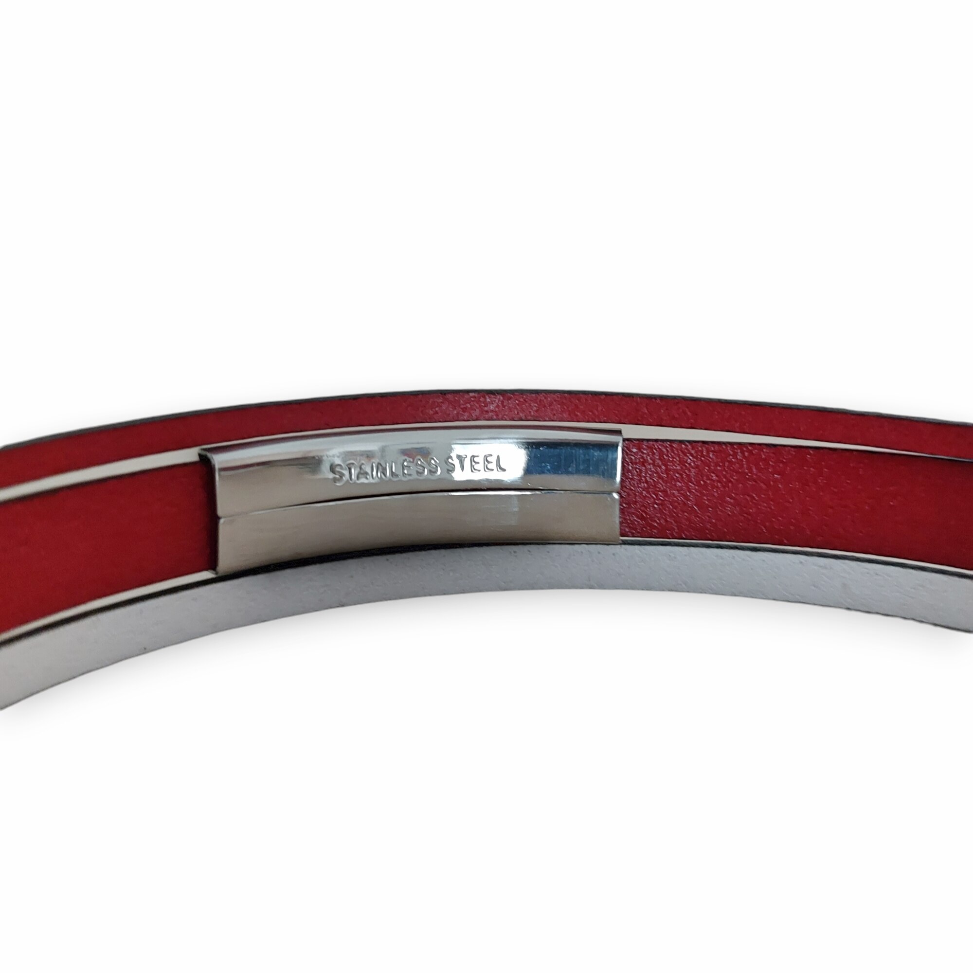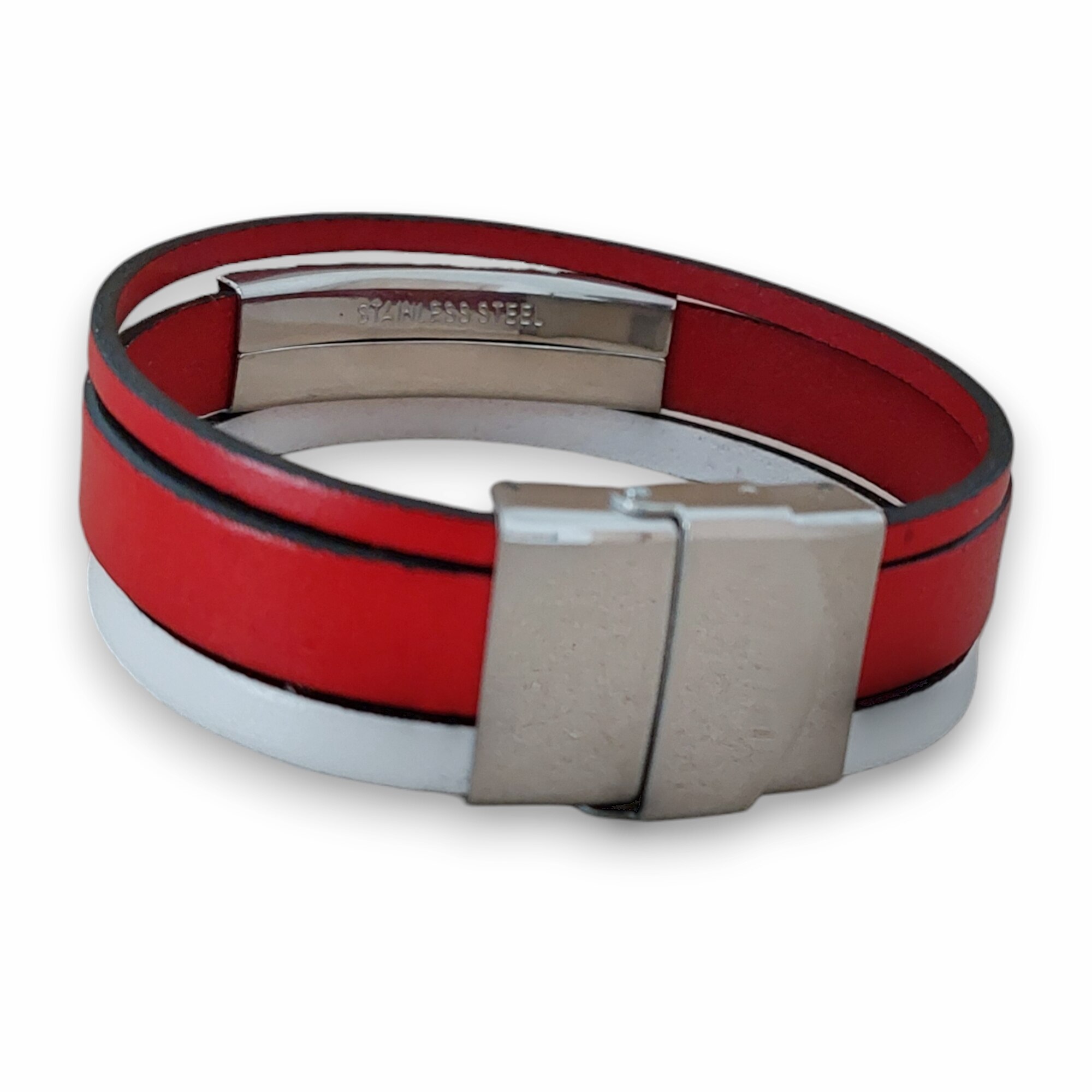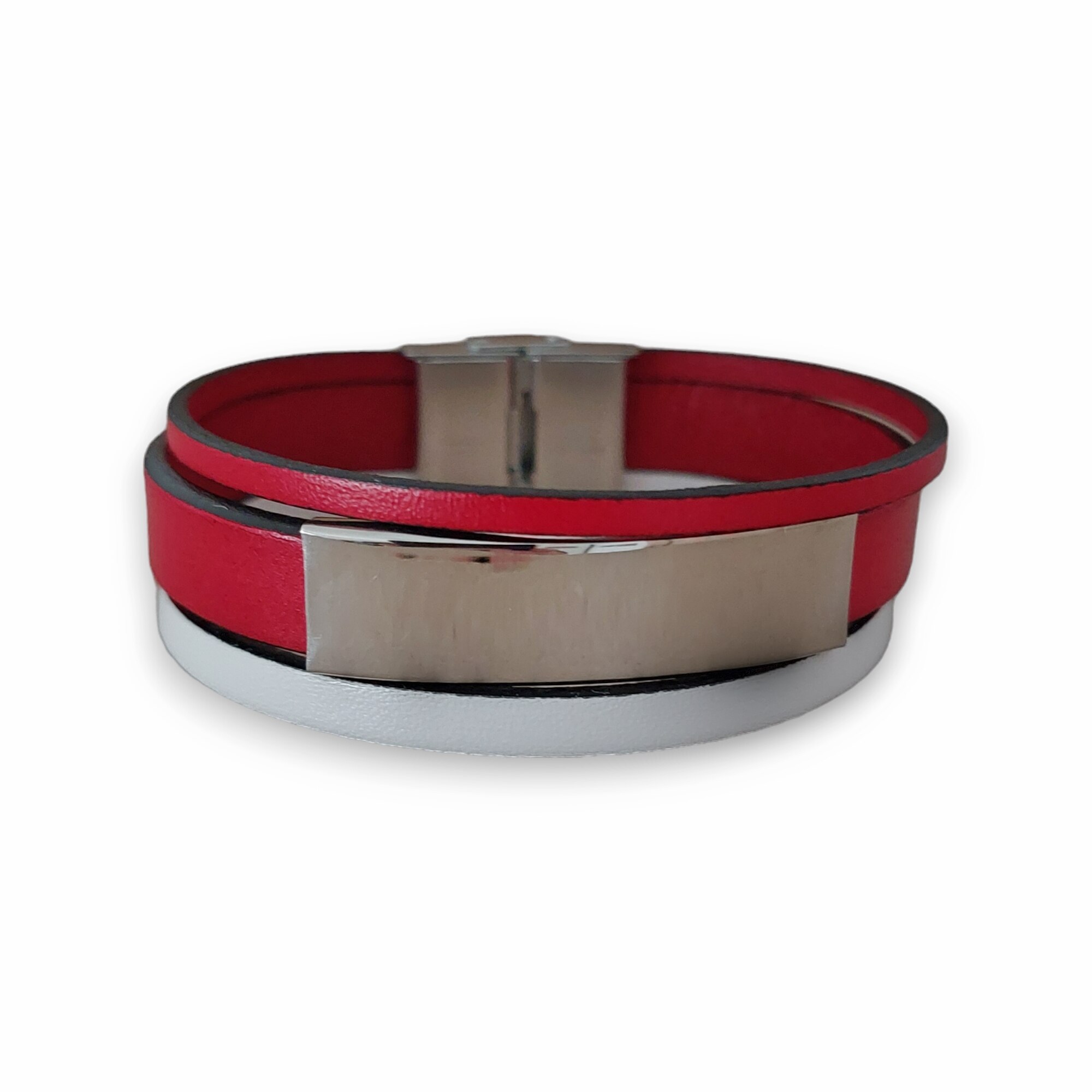 Bratara cu 3 benzi piele naturala, culoare alb cu rosu, inchizatoare si element decorativ slide din otel inoxidabil. Lungimea se poate micsora