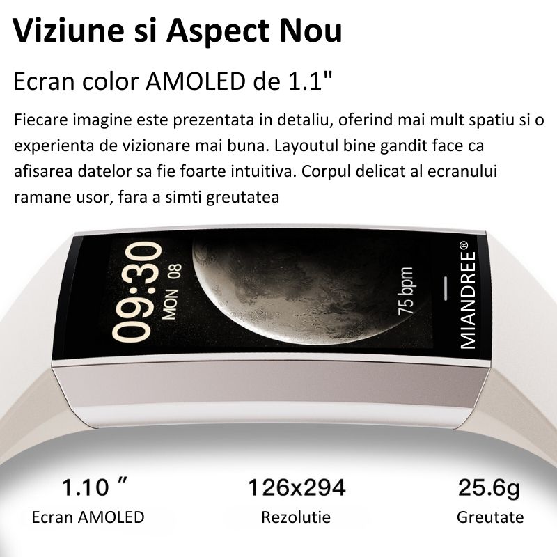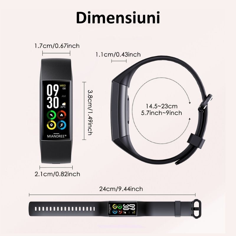 Bratara Fitness MIANDREE® cu 25 Sporturi Monitorizate, Puls, Somn, Tensiometru si Oximetru, Display AMOLED, Always-On Display, 7 Zile Autonomie, Compatibil Iphone, Samsung, Xiaomi, Huawei, Oneplus, Negru