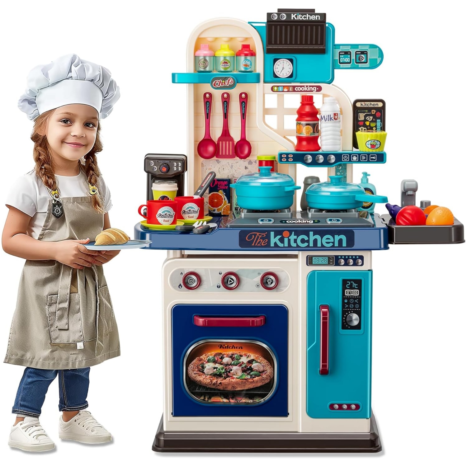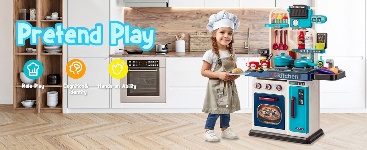Bucatarie Multifunctionala Copii, RorAem, Bucatarie multifunctionala cu 53 pise, Poate fi asamblat si dezasamblat, apa circulanta, iluminat, efecte sonore, frigider, cuptor, cu placa bateriei, Albastru