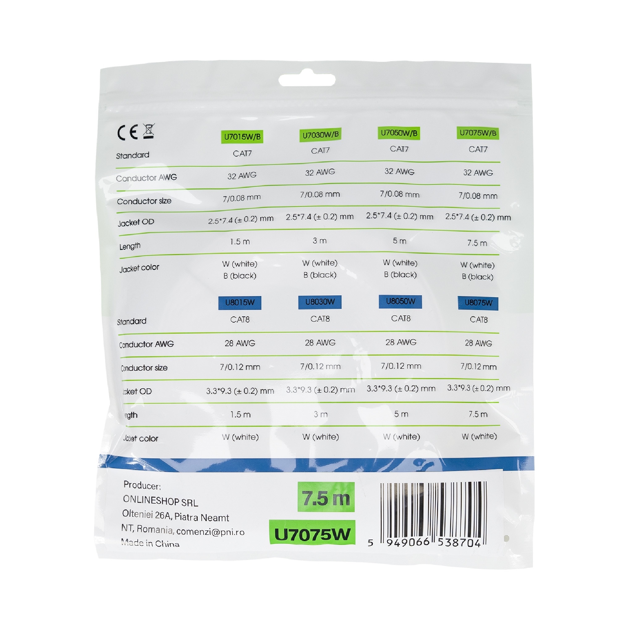 Cablu de retea plat S/STP CAT7 PNI U7075W, 2 x RJ45, 4 perechi de fire, 32AWG, cupru, 10 Gbps, 600 MHz, 7.5m, alb