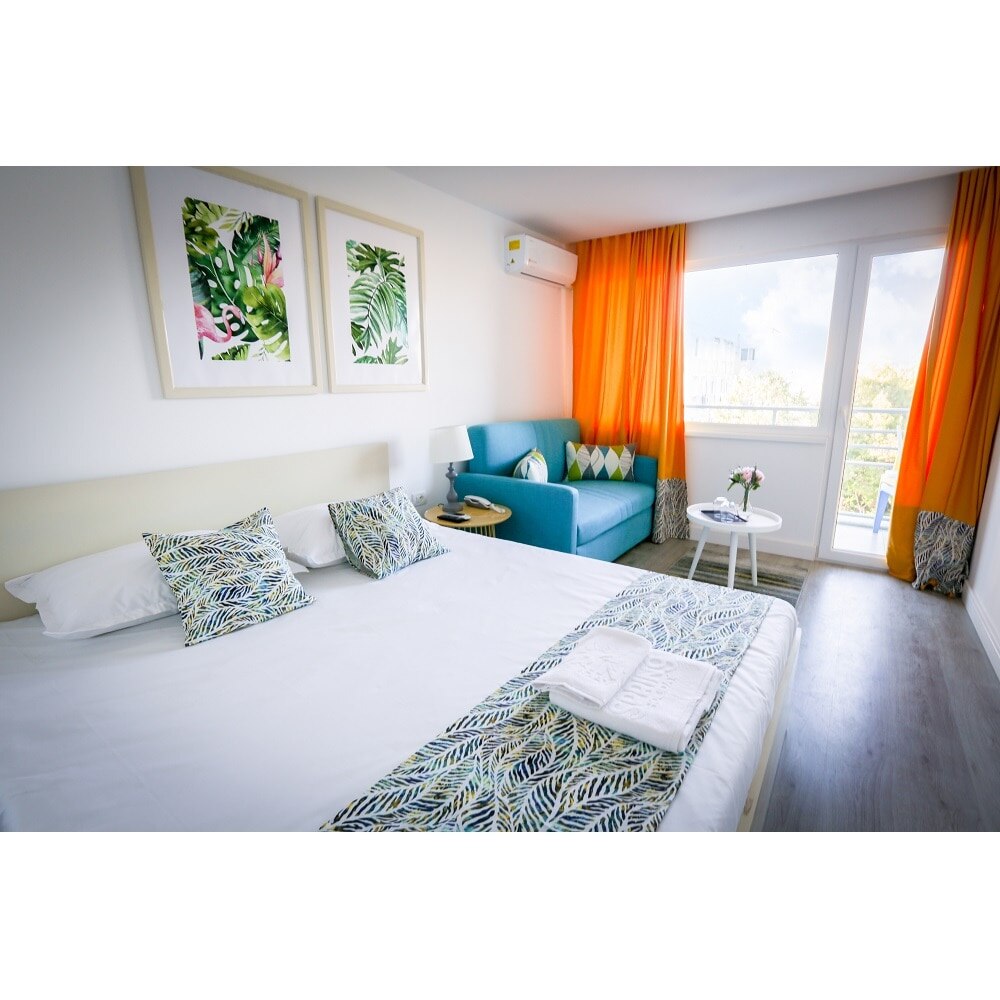 Camera dubla matrimoniala: cuprinde un spatiu deschis cu o suprafata de 18 mp, zona pentru dormit cu un pat matrimonial, cu sau fara canapea extensibila 134 cm * 194 cm, baie cu dus si balcon.