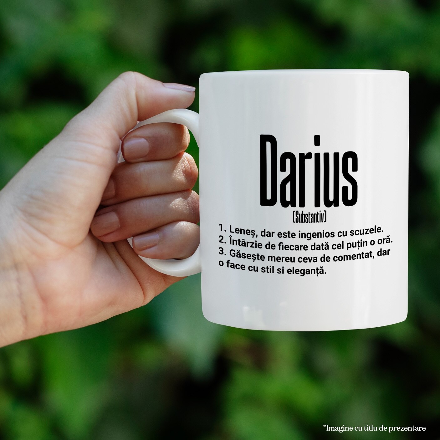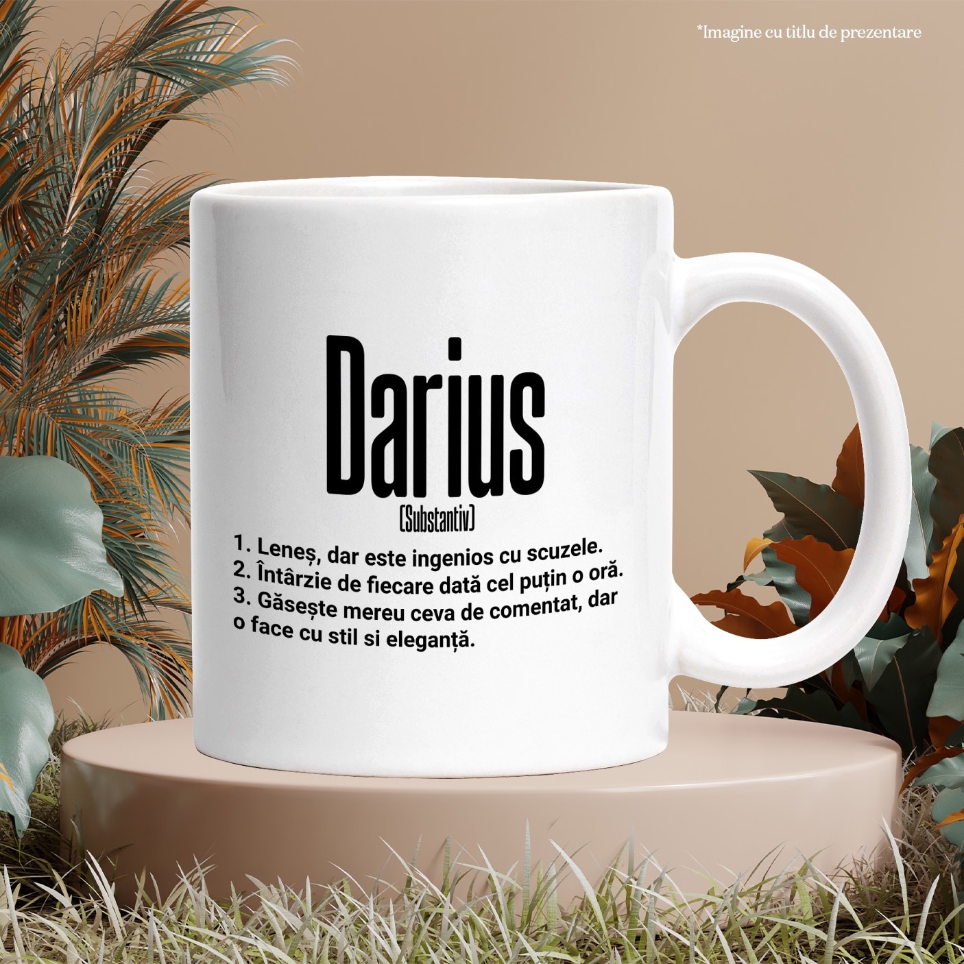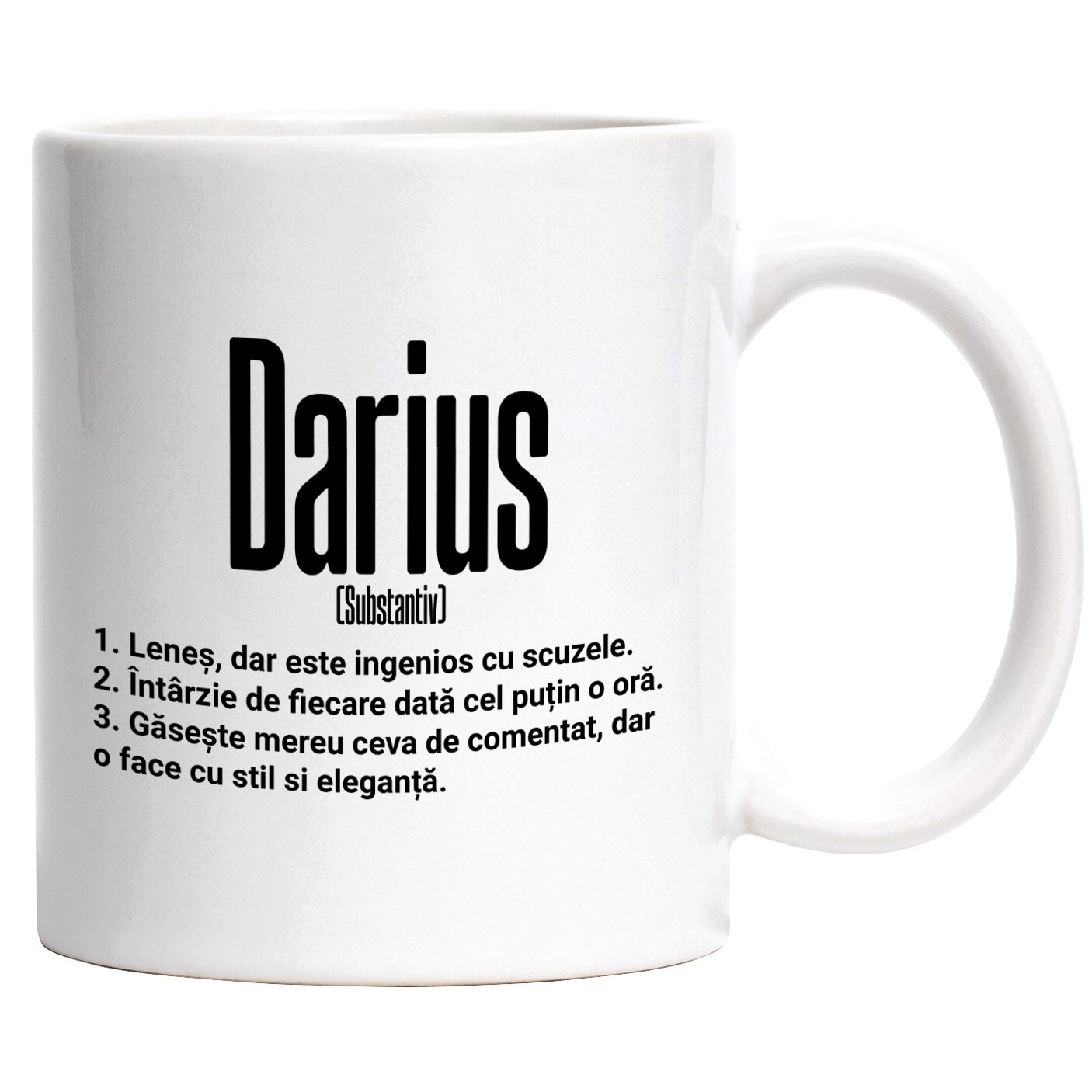 Cana Cu Numele Darius, Amuzant, Lenes, Haios, Funny, Personalizat, Cadou, 330ml, Ceramic cu Maner Alb