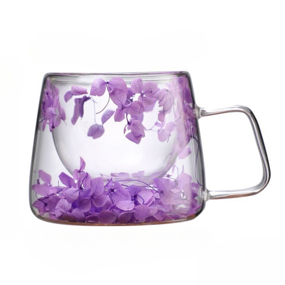 Cana termorezistenta cu perete dublu ceai/cafea, Decorare de flori uscate, Hortensia, Sticla, Perete dublu, 200ml, Transparent, violet