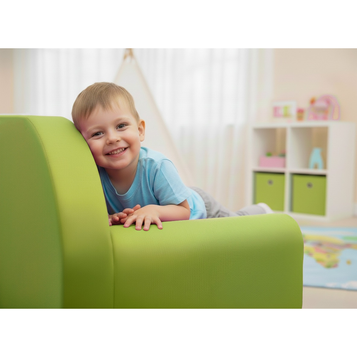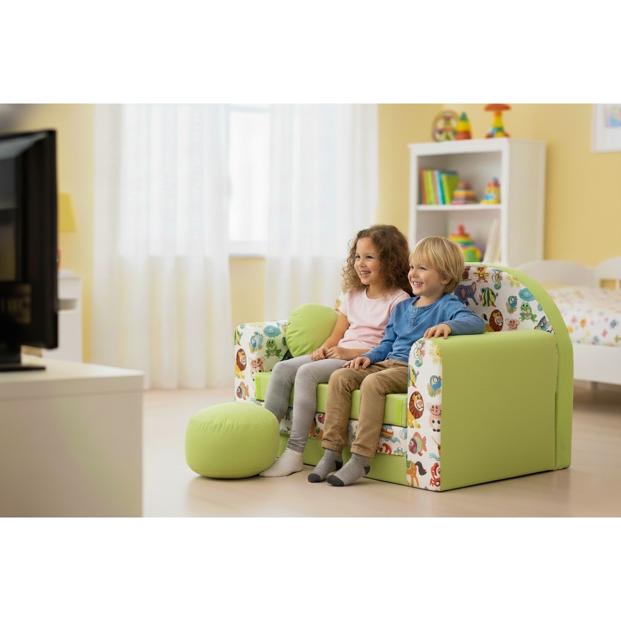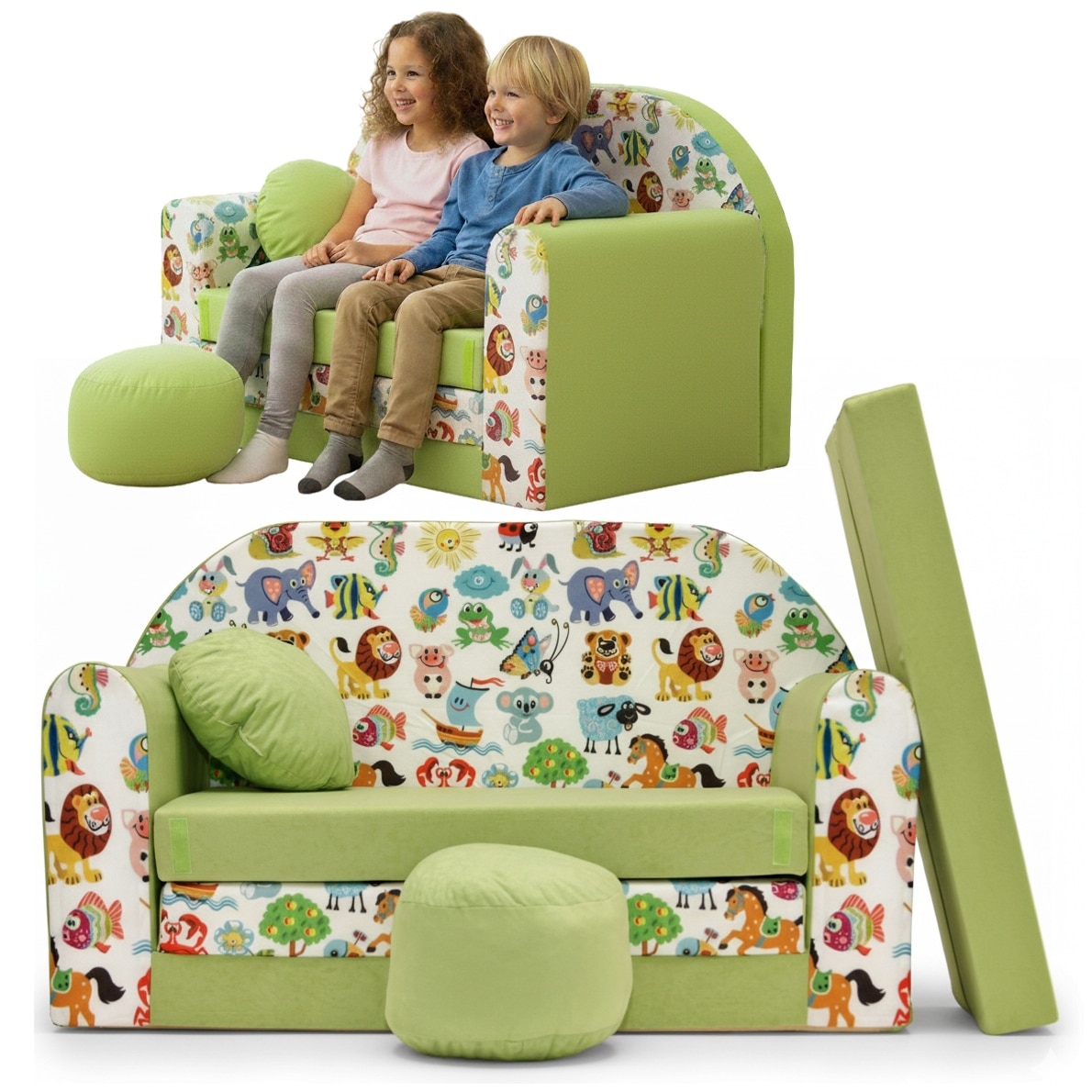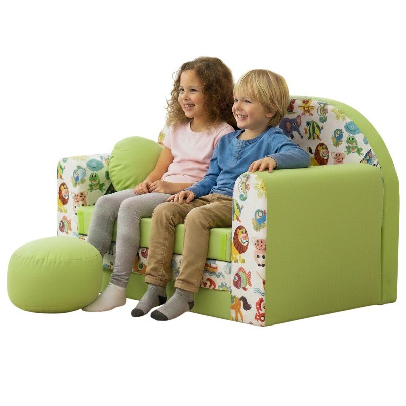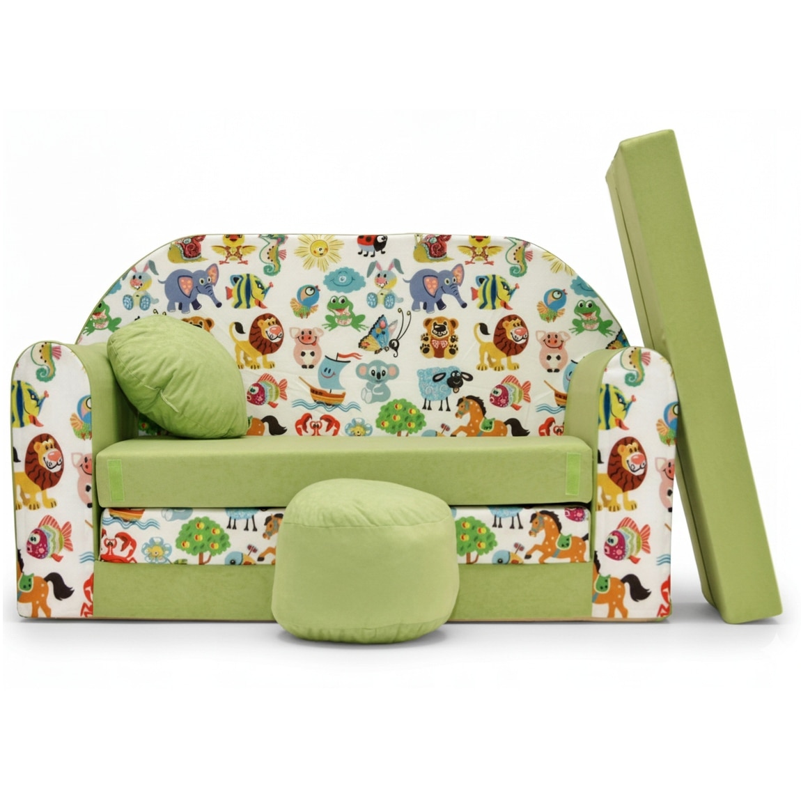 Canapea pliabila pentru copii Tuppi, 160x98x60cm, Din spuma, Husa detasabila, Model animale de safari cu verde, Multicolor