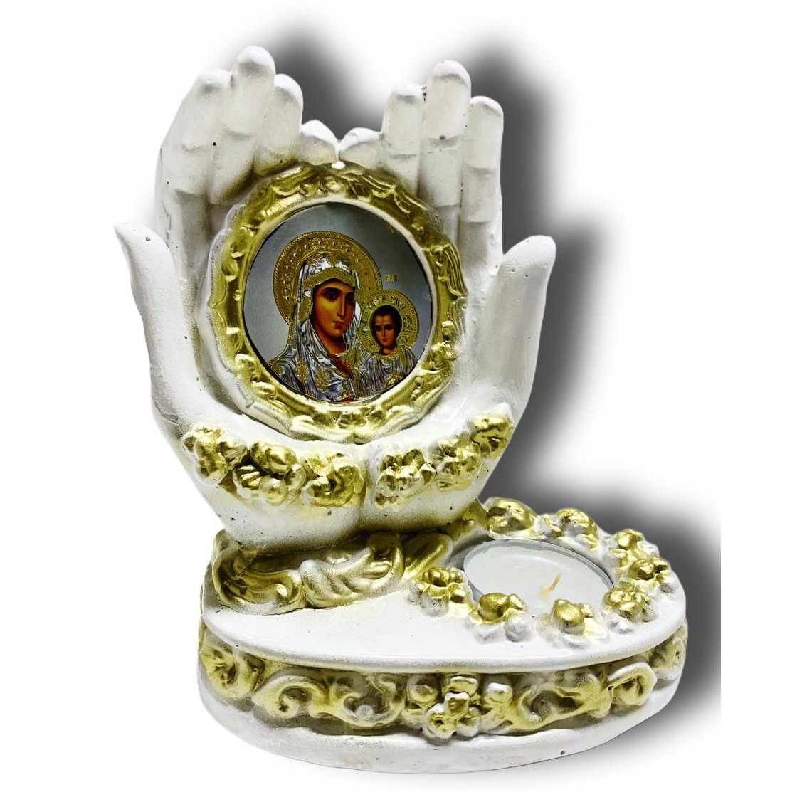 Candela din Ipsos, tip manuta cu Maica Domnului si Pruncul Iisus, cu lumanare tip pastila inclusa