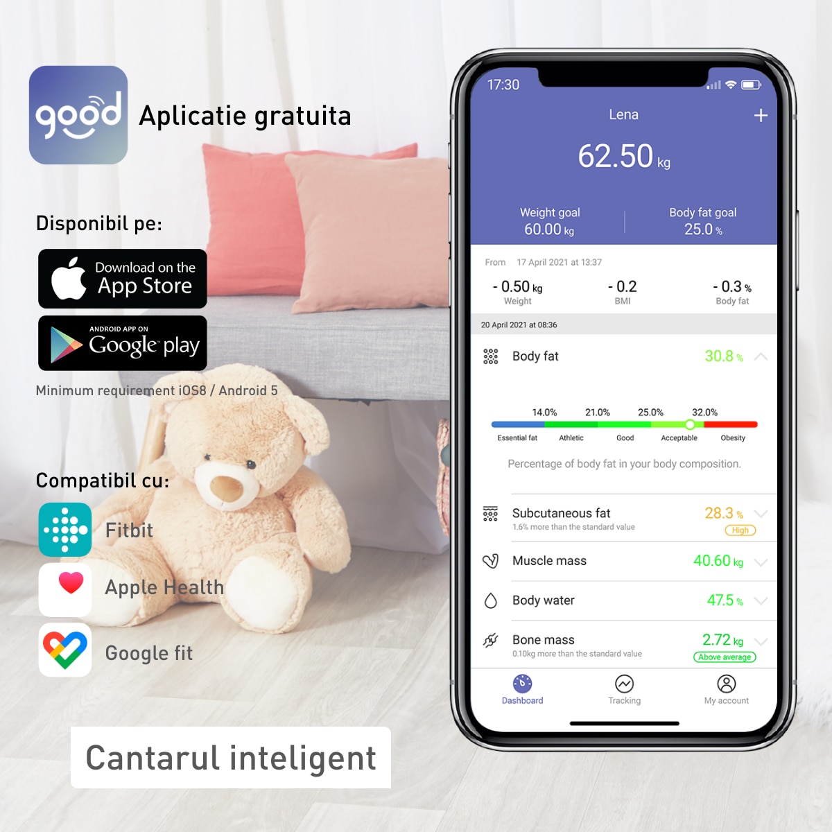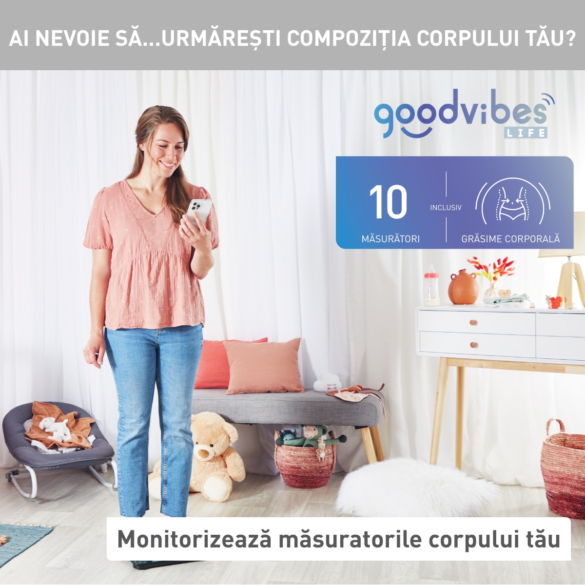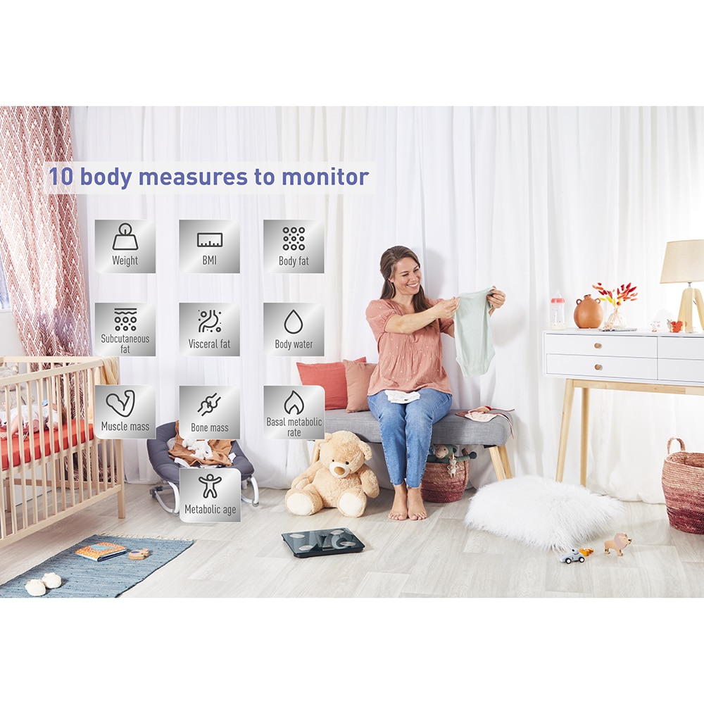 Mai mult decat o simpla cantarire: 10 masuratori: greutate, BMI, procentaj de grasime, masa musculara, masa osoasa, cantitatea de apa din corp, grasime viscerala, BMR, varsta metabolica, grasime subcutanata.