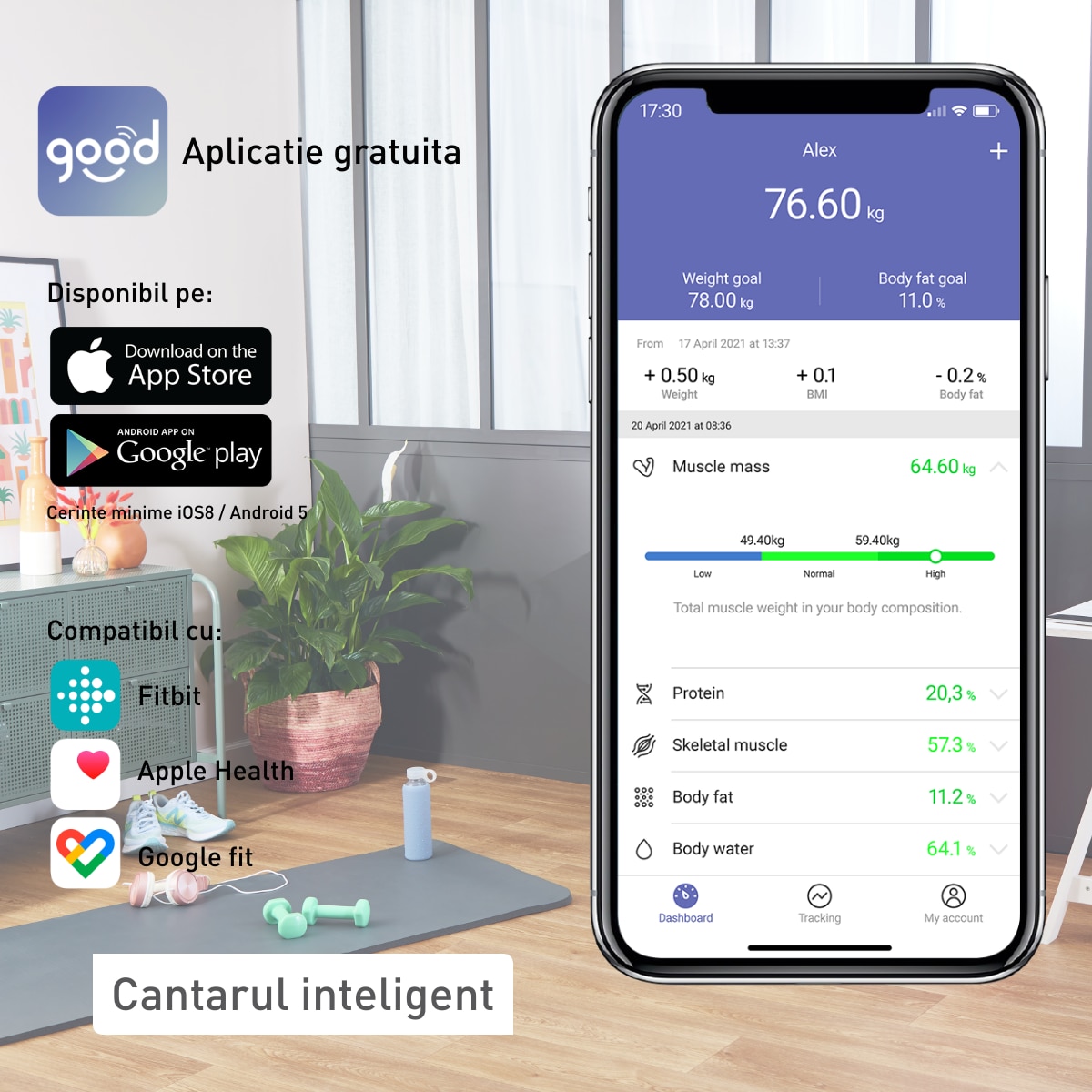 Aplicatia iti va permite sa monitorizezi mai mult decat simpla greutate, pana la 10 alte masuratori: greutate, BMI, procentaj de grasime, masa musculara, masa osoasa, cantitatea de apa din corp, grasime viscerala, BMR, varsta metabolica si grasime subcutanata.